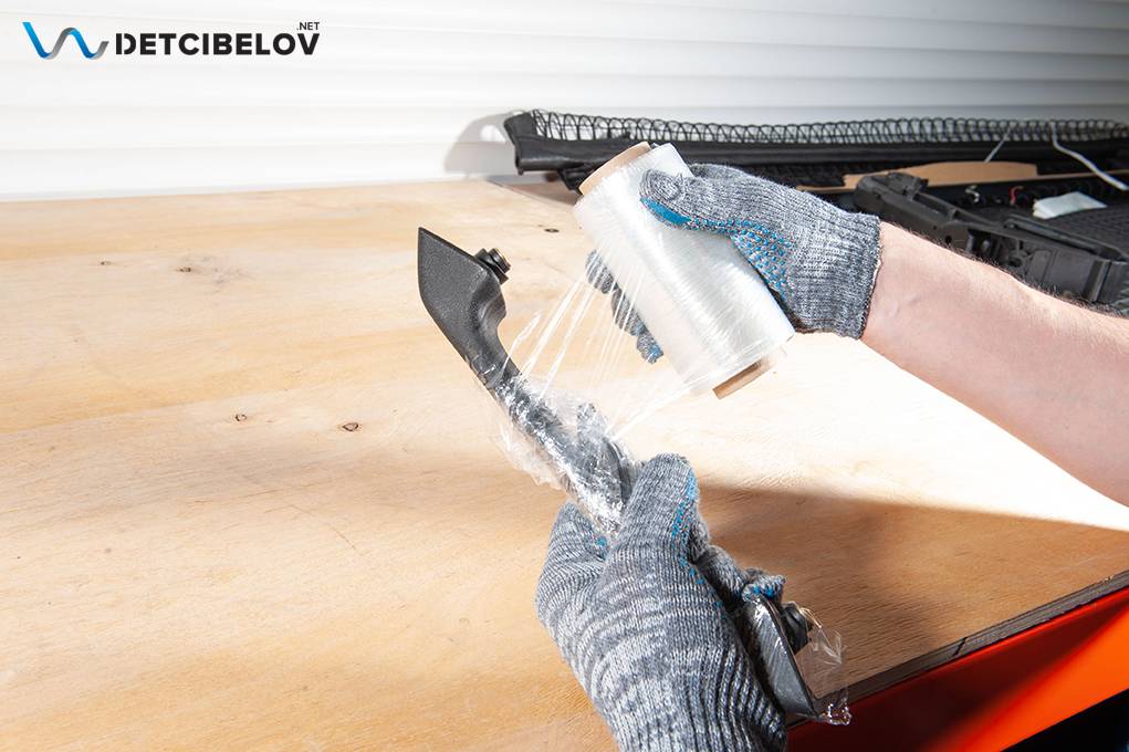 Приступаем к работе. Первым делом максимально защищаем автомобиль: оклеиваем пленкой все внешние элементы автомобиля, затем наносим скот на пороги и арки дверей, упаковываем все мелкие пластиковые элементы в стретч-пленку. Сиденья и карты дверей помещаем в специальные чехлы.