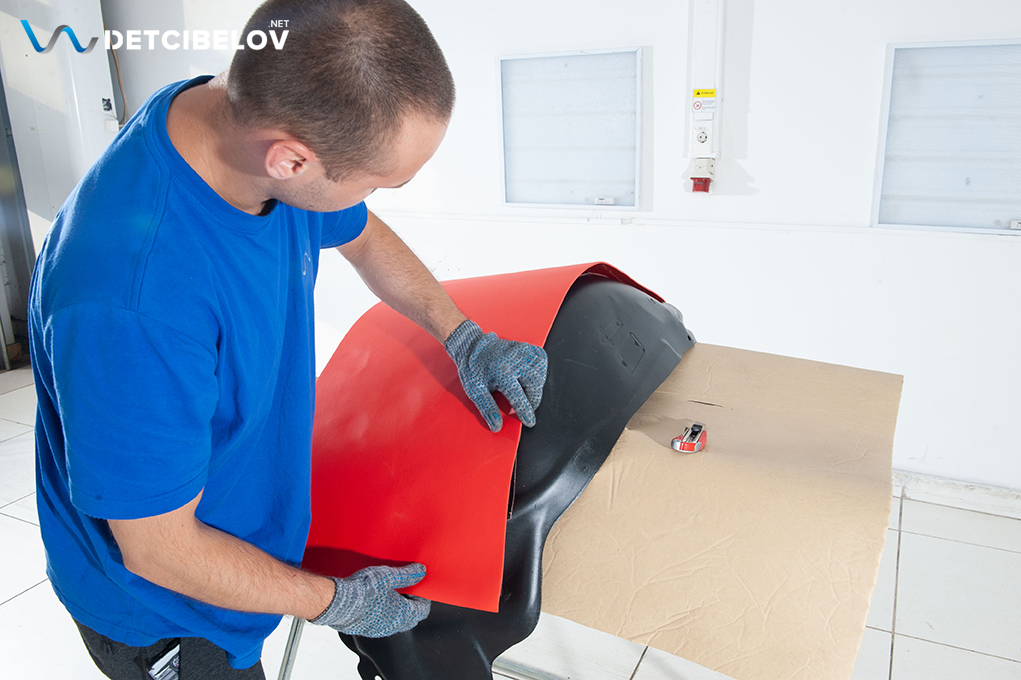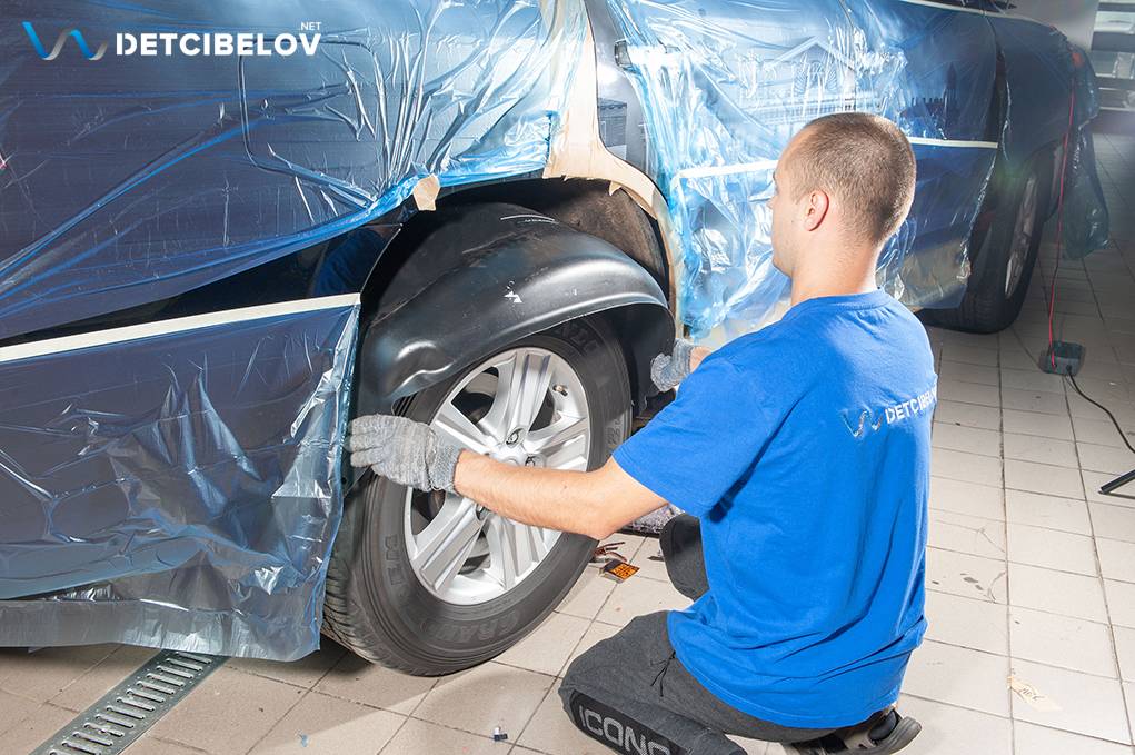 Приступаем к работе. Первым делом максимально защищаем автомобиль: оклеиваем пленкой все внешние элементы автомобиля, затем наносим скот на пороги и арки дверей, упаковываем все мелкие пластиковые элементы в стретч-пленку. Сиденья и карты дверей помещаем в специальные чехлы.