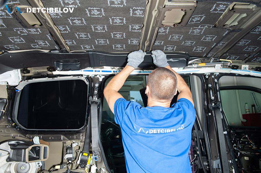 Затем приступаем к шумоизоляции потолка. Максимально аккуратно, чистыми одноразовыми перчатками демонтируем потолочную обшивку. После обезжиривания поверхности потолка начинаем монтаж виброизолятора Comfort mat Dark D3 Premium, а затем один из лучших звукопоглощающих материалов Comfort mat Felton (10мм.), который изготовлен из особого акустического войлока повышенной плотности по технологии термического скрепления. Одновременно 2 и 3 слой шумоизоляции и дополнительно армирован ламинированным нетканым полотном.