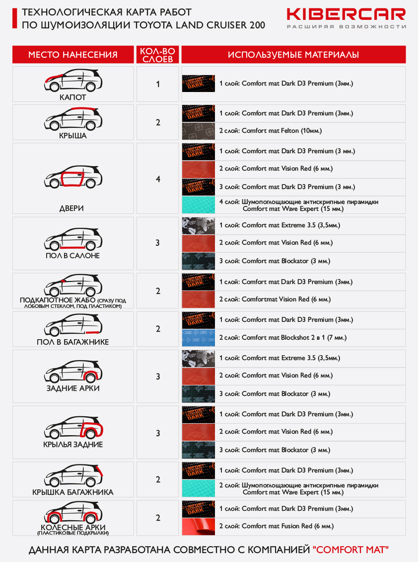 Первым слоем у нас идет облегченный виброизолятор Comfort mat Dark D3 Premium. Вторым слоем, Comfort mat Vision Red 6 обладающий повышенными шумопоглощающими характеристиками материал. Третьим слоем виброизолятор Comfort mat Dark D3 Premium и четвертым, заключительным слоем, мы используем шумопоглощающий материал последнего поколения, пенополиуретановую пенорезину Comfort mat Wave Expert 15мм с увеличенным коэффициентом шумопоглощения, который окончательно задерживает посторонние шумы, этот же материал, выступает в роли Анти-скрипа.