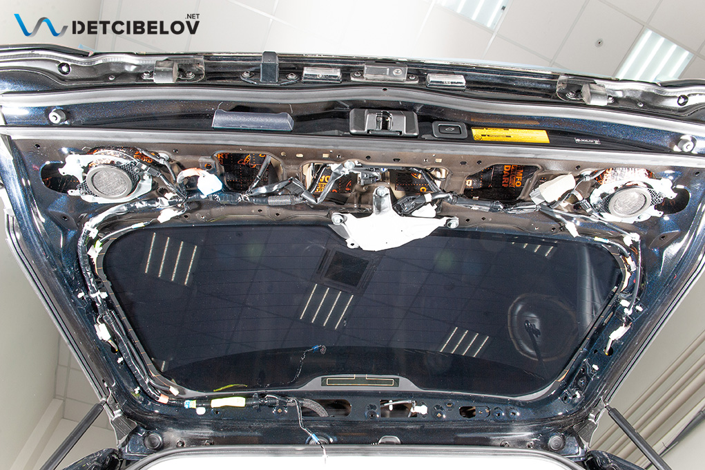 Внутренняя поверхность капота была обработана материалом Comfort mat Dark D3 , и возвращенной штатной шумо-пыле-изоляции , а на крышку багажника мы нанесли Comfort mat Dark D3 и на пластиковую панель наклеили Comfort mat Wave Expert 15мм с увеличенным коэффициентом шумопоглощения.