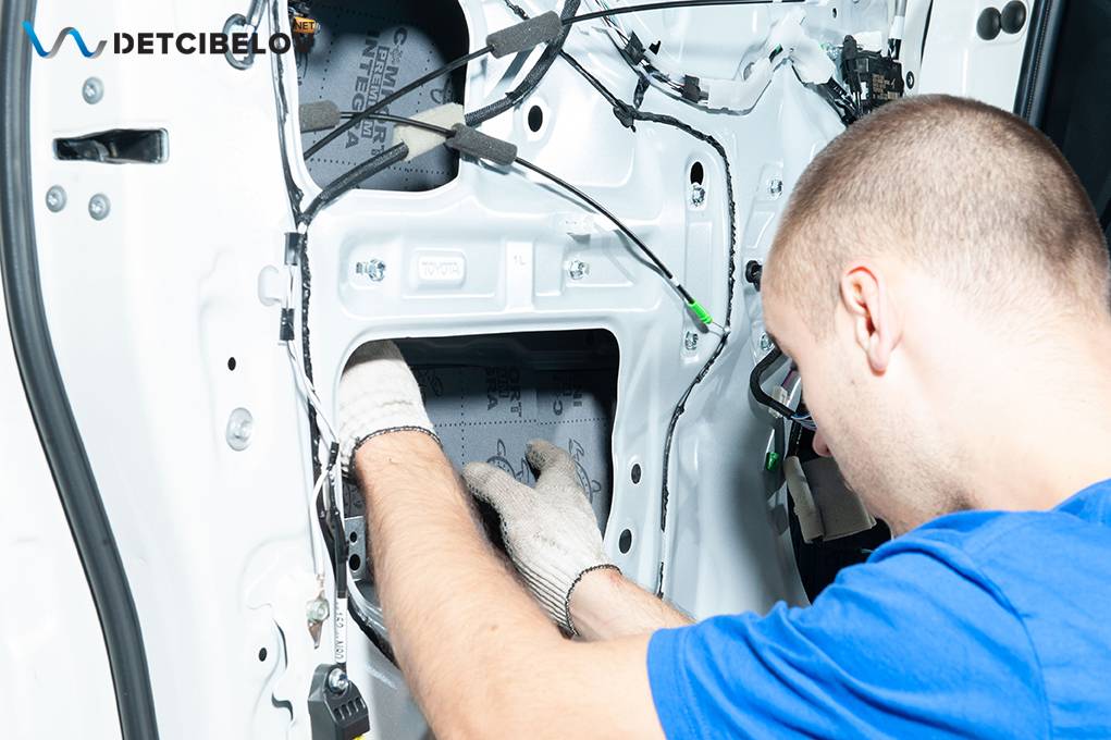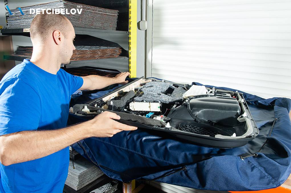 Работы по шумоизоляции начинаем с дверей, максимально аккуратно разбираем дверные обшивки. После того, как дверь разобрана, подготавливаем поверхность и обезжириваем все участки, на которые будут наноситься виброизоляционные материалы.