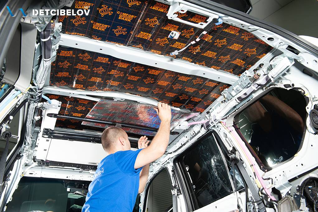 Затем приступаем к шумоизоляции потолка. Максимально аккуратно, чистыми одноразовыми перчатками демонтируем потолочную обшивку. После обезжиривания поверхности потолка начинаем монтаж виброизолятора Comfort mat Dark D3 Premium, а затем шумопоглотитель Comfort mat SkyLine — это легкая мембранная звукоизоляция, рабочая часть этого шумоизоляционного материала состоит из шумоизоляционной прослойки, накрытой плотной тонкой звукоизоляционной мембраной.