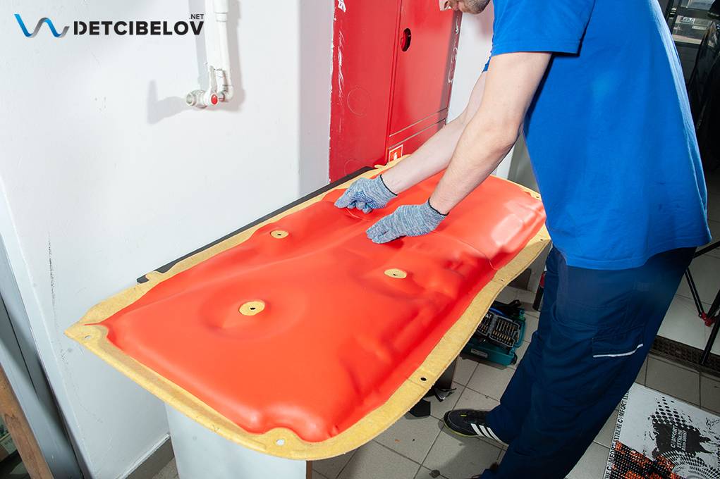 Далее приступаем к самой ответственной части шумоизоляции автомобиля - пола, багажника и внутренних колесных арок. Данный этап начинается с полного демонтажа сидений, ковров, обшивок и т.д., ничего не должно мешать проводимым работам. Для виброизоляция пола мы используем вибродемпфер Comfort mat Extreme 3.5 — это мастично-битумный сэндвич с рекордной толщиной 3,5 мм и двумя слоями фольги, который убирает низкочастотные структурные шумы металла. Это «Царь» среди виброизоляционных материалов, с уникальной структурой мастики и лучшими показателями снижения вибрации. Нагреваем его при температуре 60-80 градусов в специальной печи, это обязательное условие, иначе качественно нанести этот материал не удастся.