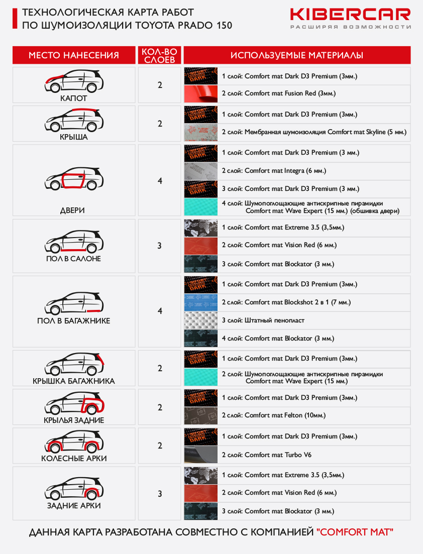 Финальным этапом шумоизоляции Toyota LC150 Prado будет, шумоизоляция колесных арок. Из-за нанесенного на заводе антикоррозионного покрытия на внутреннюю часть колесных арок, нанесение виброизоляции не возможно. В данном случае мы обработали подкрылки этого автомобиля в два слоя. Первый слой виброизолирующий материал Comfort mat Dark D3 , а вторым слоем будет Comfort mat Vision (black) легкий, водонепроницаемый, устойчивый к климатическим изменениям, обладающий повышенными шумопоглощающими характеристиками материал. Это позволит нам существенно усилить эффект снижения шума издаваемых резиной автомобиля.