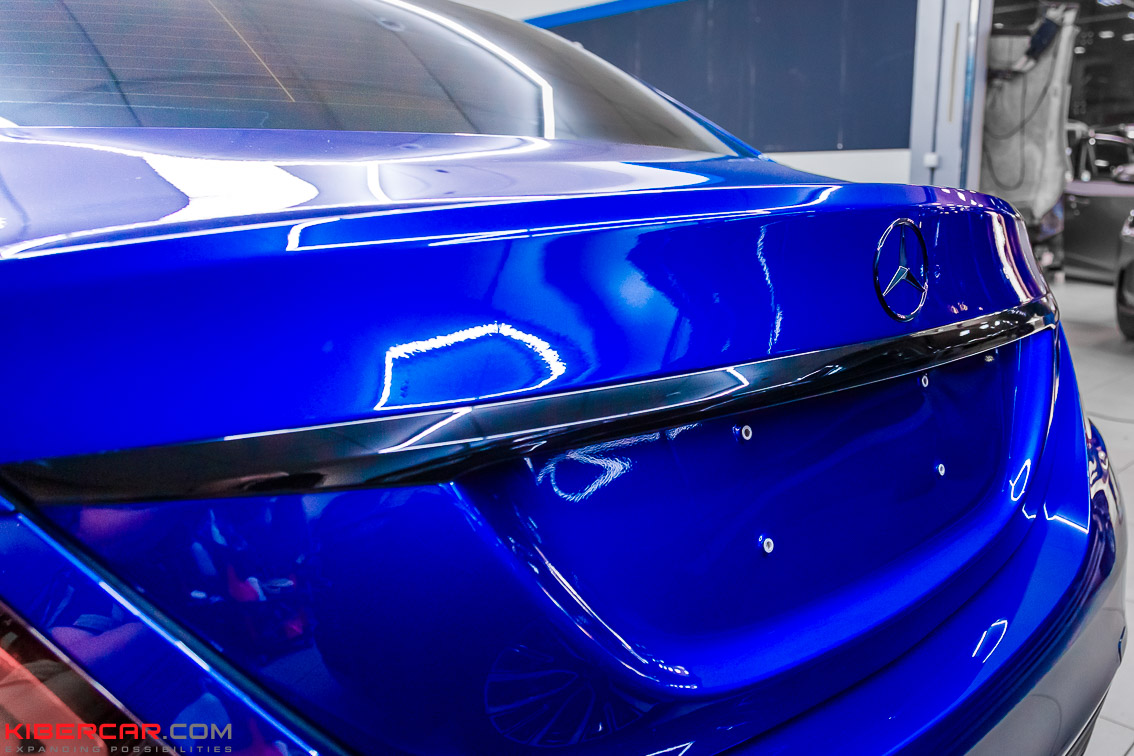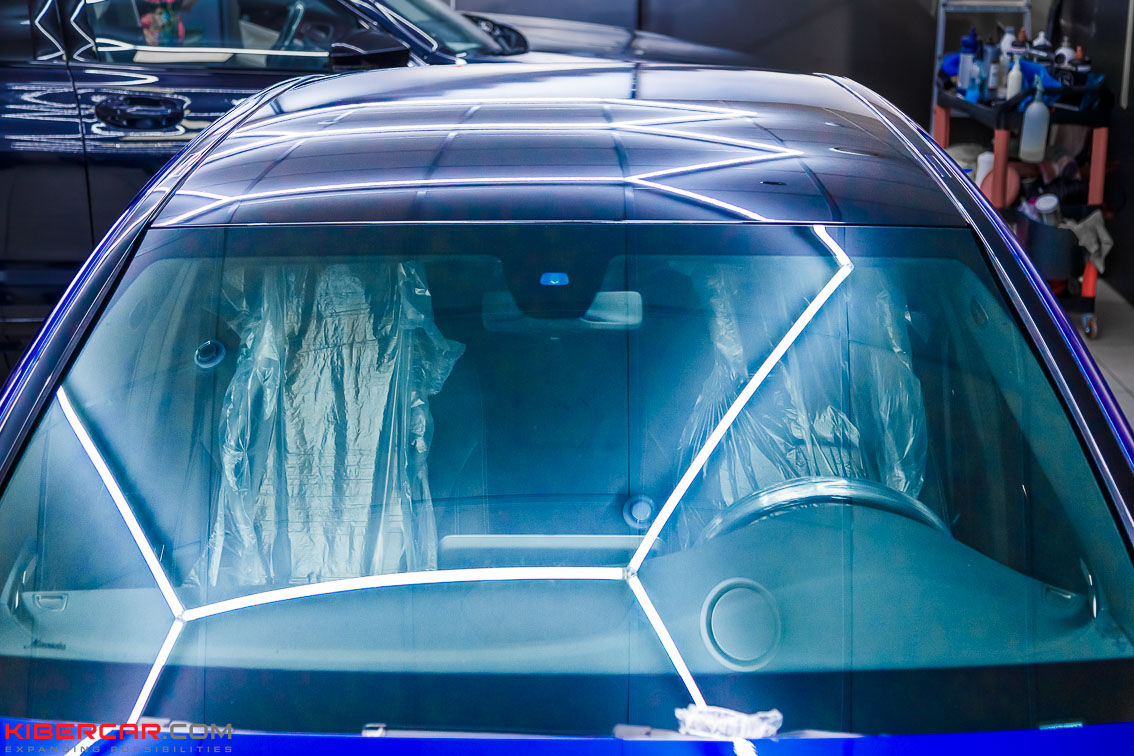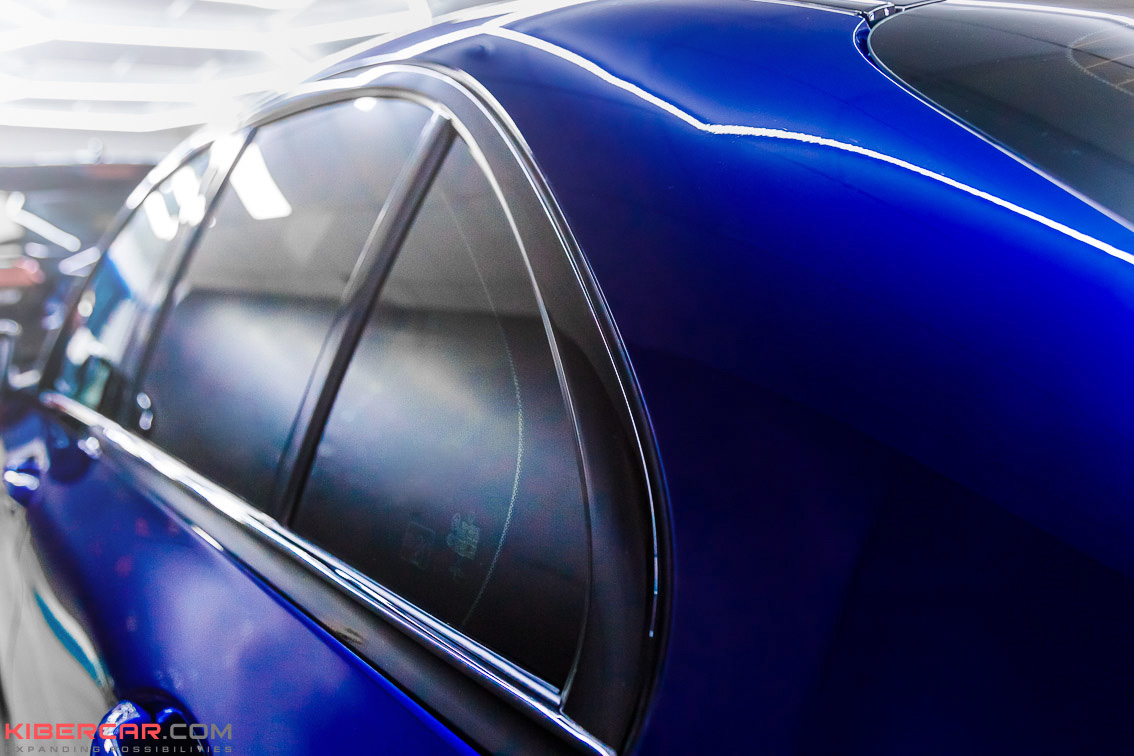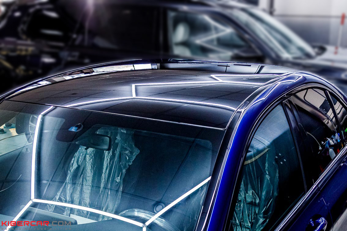 Лакокрасочное покрытие было отполировано, чтобы устранить небольшие царапины и повреждения. А для дальнейшей защиты было нанесено керамическое покрытие. Керамический слой уберегает ЛКП авто от неприятных случайностей – пескоструя, царапин, легких повреждений, действия химреагентов. Крышу автомобиля мастера оклеили черным полиуретаном, который отличается хорошими защитными свойствами.