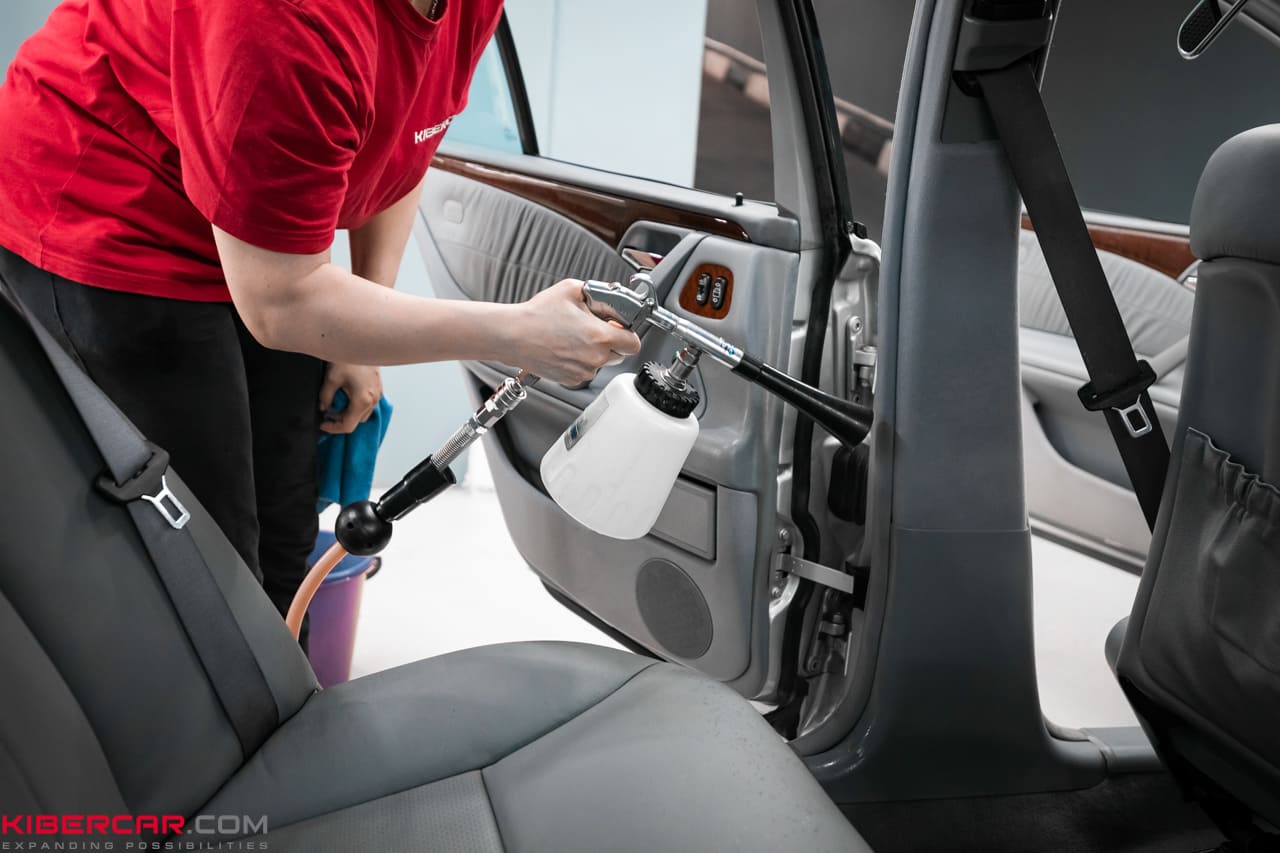 Нанесение чистящего средства. Мы выбрали безопасные для кожи и тканей средства, которые не содержат агрессивных химикатов и не смоют краску. С помощью торнадора средство наносилось равномерно по всей поверхности кожаных сидений и других элементов салона.