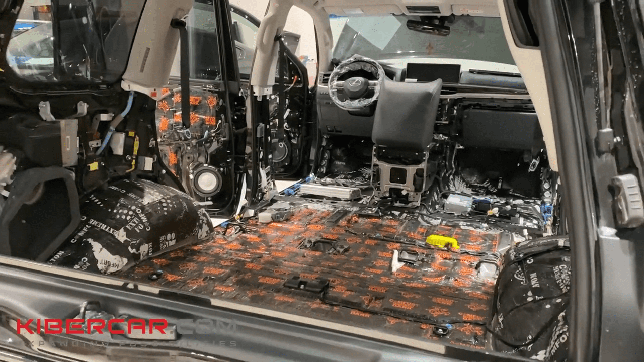 Мастера приступили к работе. Для этого был полностью демонтирован салон и даже обшивка. Мы уложили изоляцию на пол, потолок, двери, багажник и колесные арки.