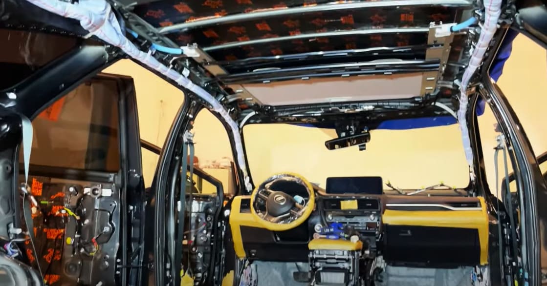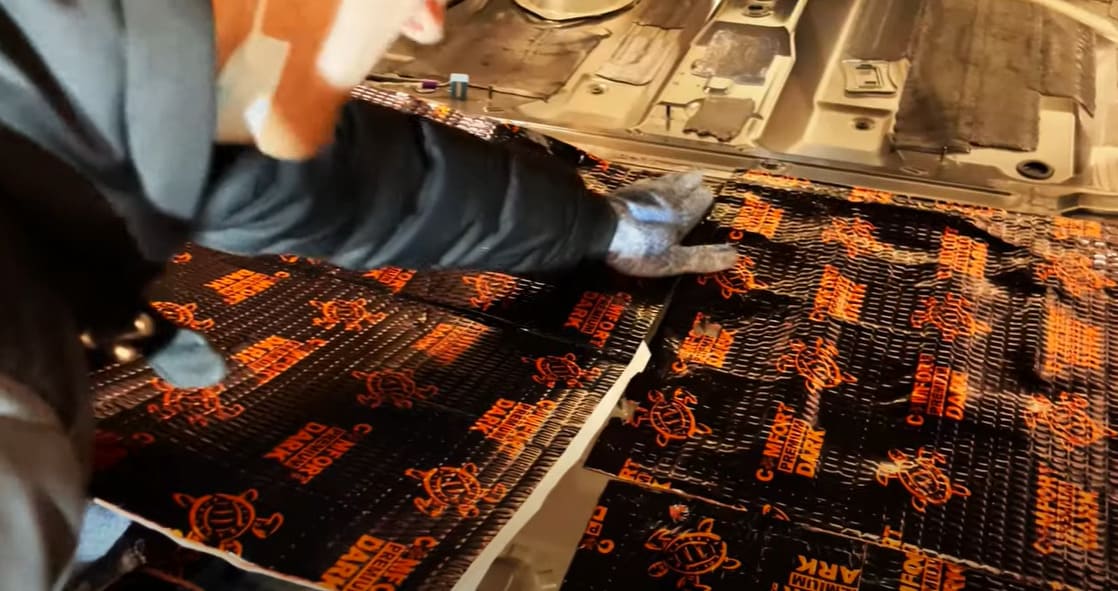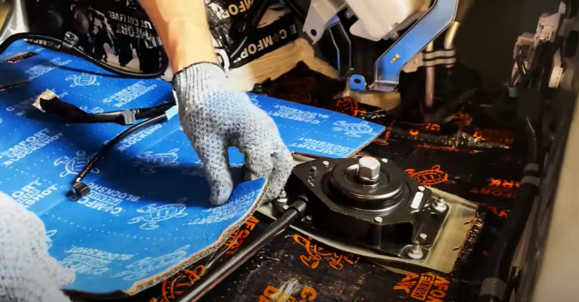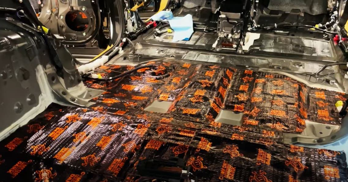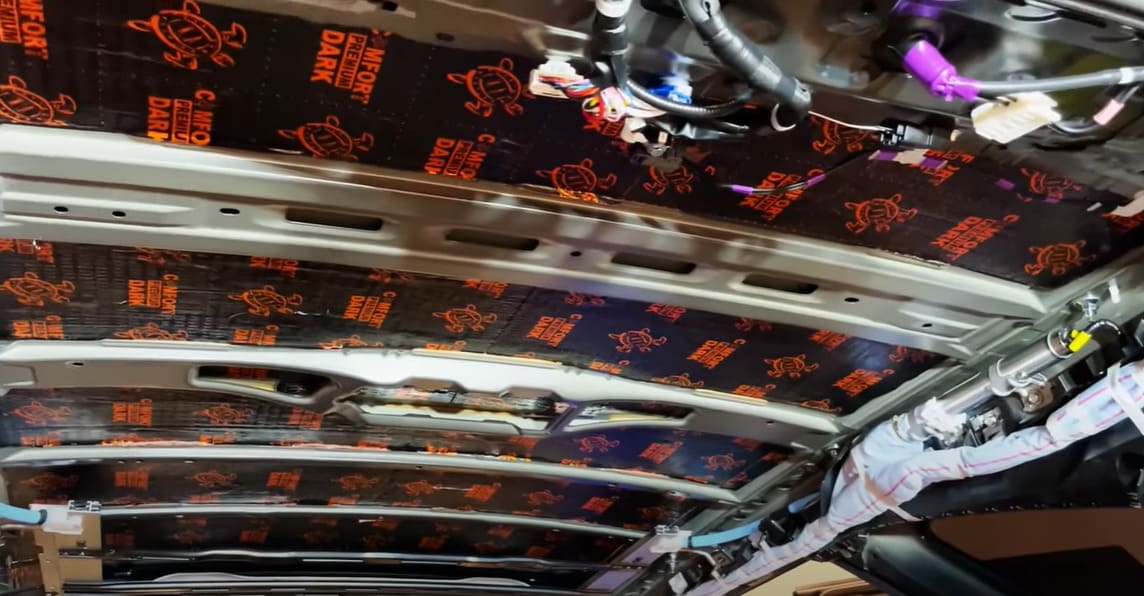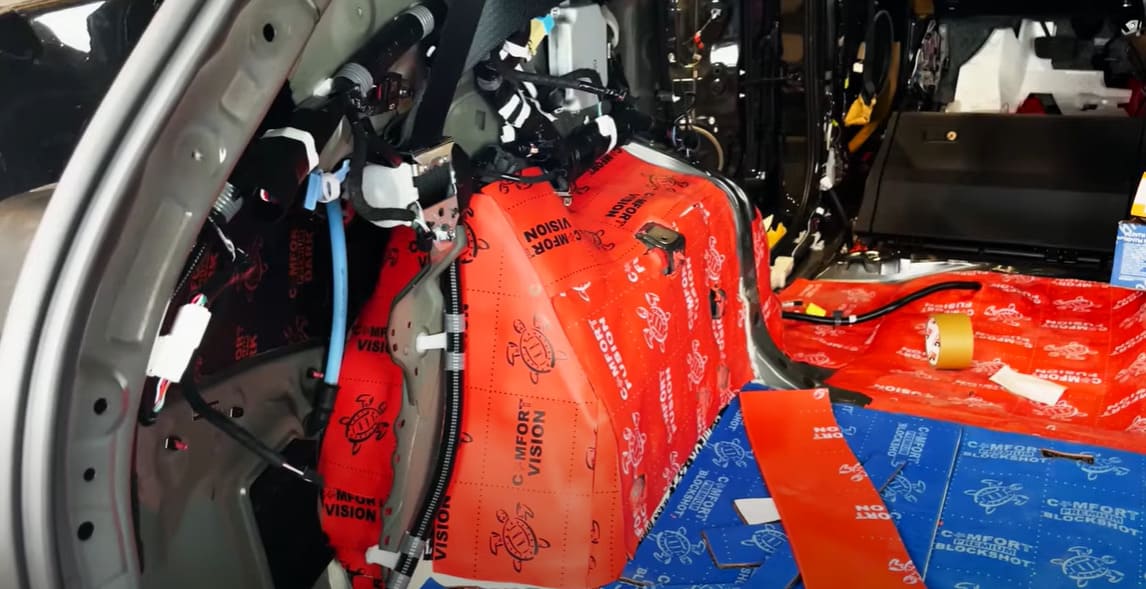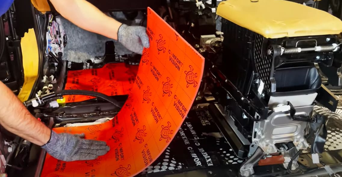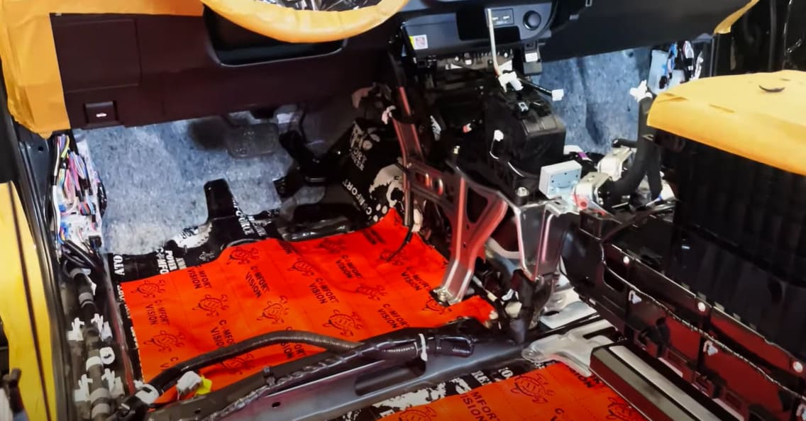 Следующий вид работ, направленный на повышение комфорта пассажиров и водителя – полная шумоизоляция. Для этого салон машины был полностью разобран с демонтажем сидений, дверных карт, обивки потолка и всех пластиковых элементов. Мы тщательно подходим к выполнению своей работы, а поэтому получаем доступ ко всем технологическим полостям, поверхность которых будет покрыта слоем шумоизолирующих материалов. Каждый из трех слоев тщательно прикатывается к основе, за счет чего обеспечивается тишина в салоне при любых скоростях движения.
