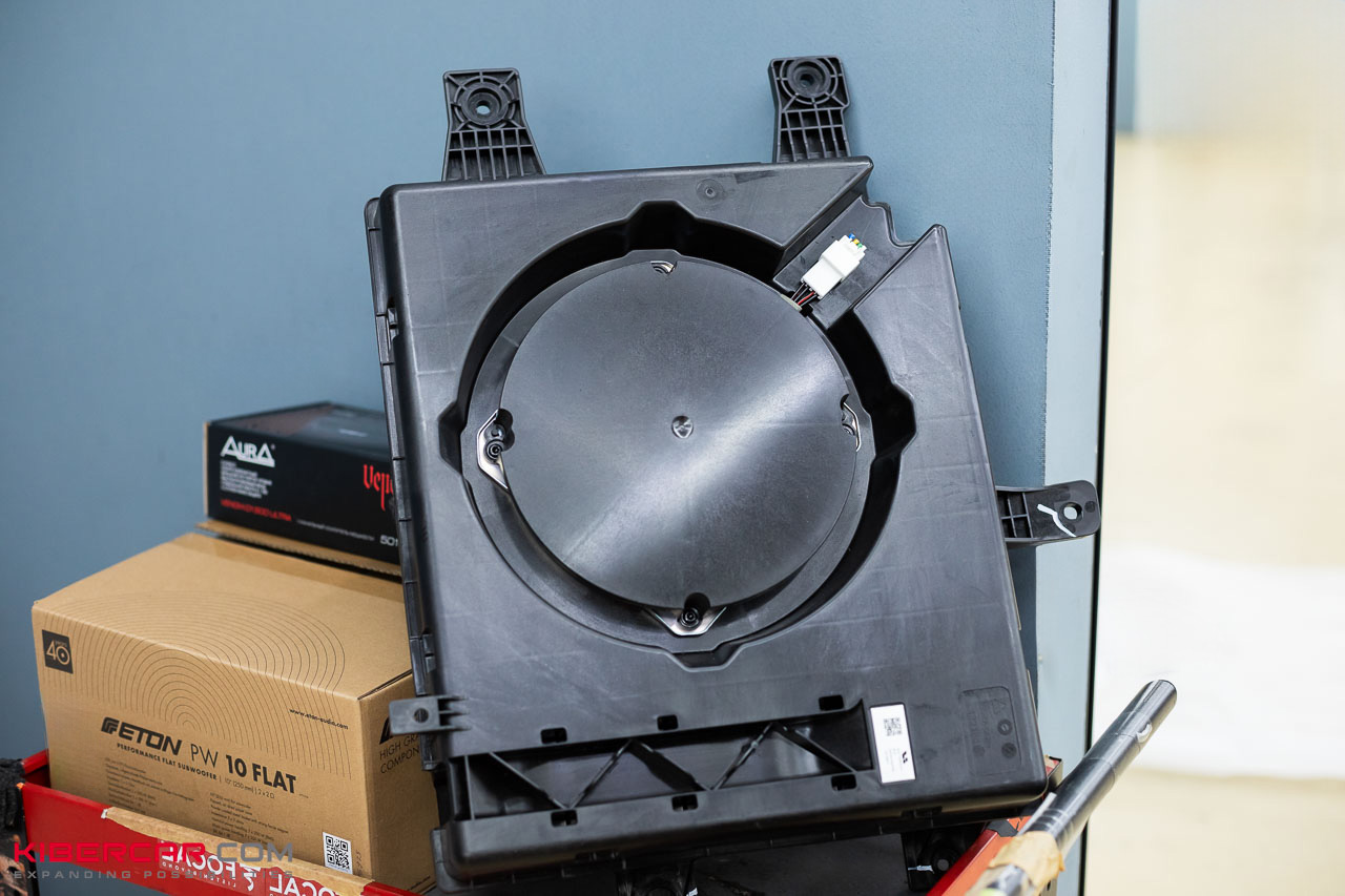 В автомобиле остались штатные акустические компоненты, но для более правильного звучания мы добавили шумоизоляцию дверей. Также заменили сабвуфер, поставив саб с низкопрофильным динамиком ETON PW10, работающим от внешнего моноблока. Его мы расположили в индивидуальном корпусе типа Stels нашего же производства. Благодаря этому процессорный усилитель, моноблок и сабвуфер располагаются в багажнике и занимают немного места.