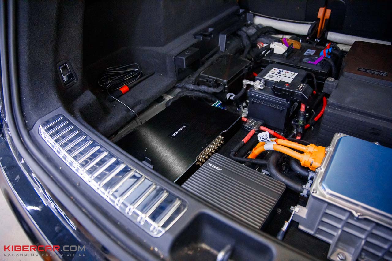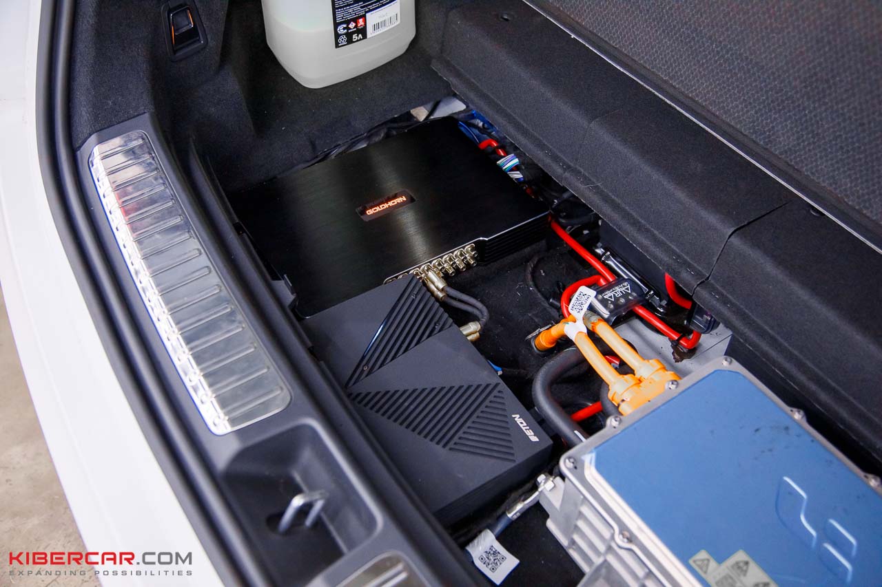 В этом проекте мы использовали 20-канальный процессорный усилитель Gold Horn АВ218. Это китайский бренд премиального качества. Мы выбрали именно 20-канальный усилитель с учетом количества всех компонентов: 6 каналов – в передних дверях, 4-х – в задних, 2-х – в багажнике, 4-х – на потолке, еще по одному – на монитор, торпеду и сабвуфер. Gold Horn АВ218 обеспечивает 100 Вт мощности для 4-х каналов, и по 50 Вт – для всех остальных. Также у него есть внешние каналы для подключения дополнительных усилителей, если захочется подключить еще что-нибудь.