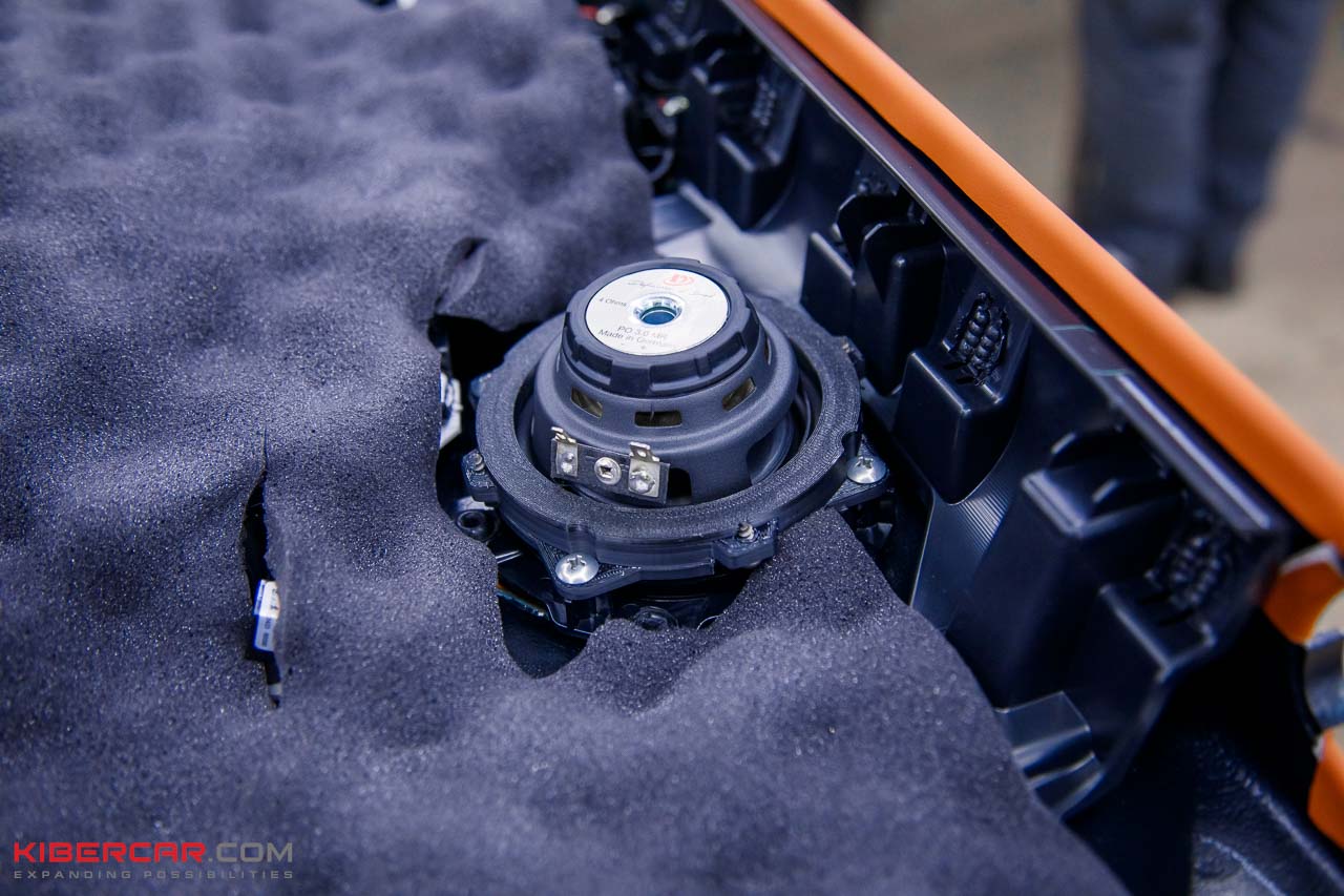 В качестве сабвуфера использовали Hertz MPS250. Благодаря малой монтажной глубине он обеспечивает мощный и качественный бас даже в условиях ограниченного пространства. Также установили моноблок Eton Stealth – со штатным корпусом, который перевернули динамиком вниз, чтобы вибрация распространялась по кузову автомобиля.