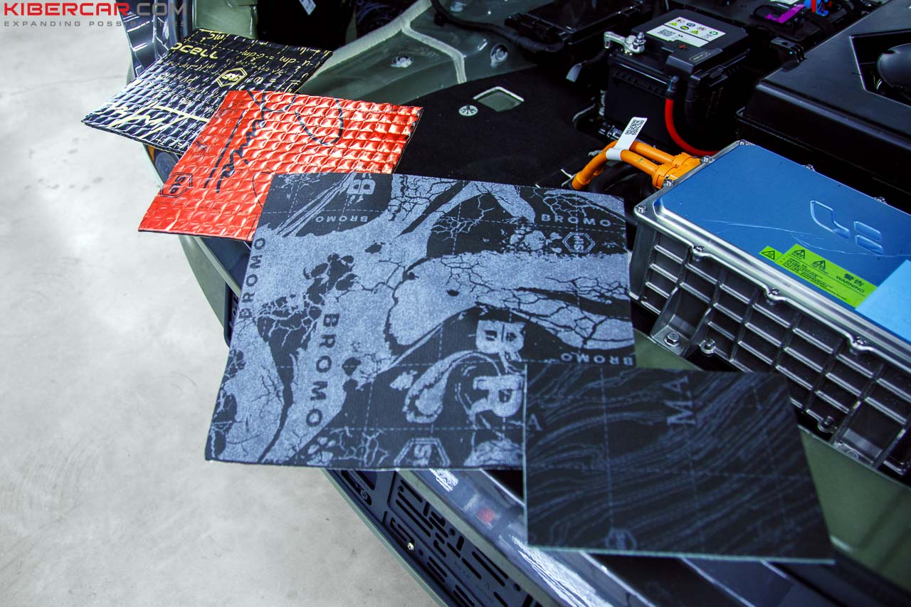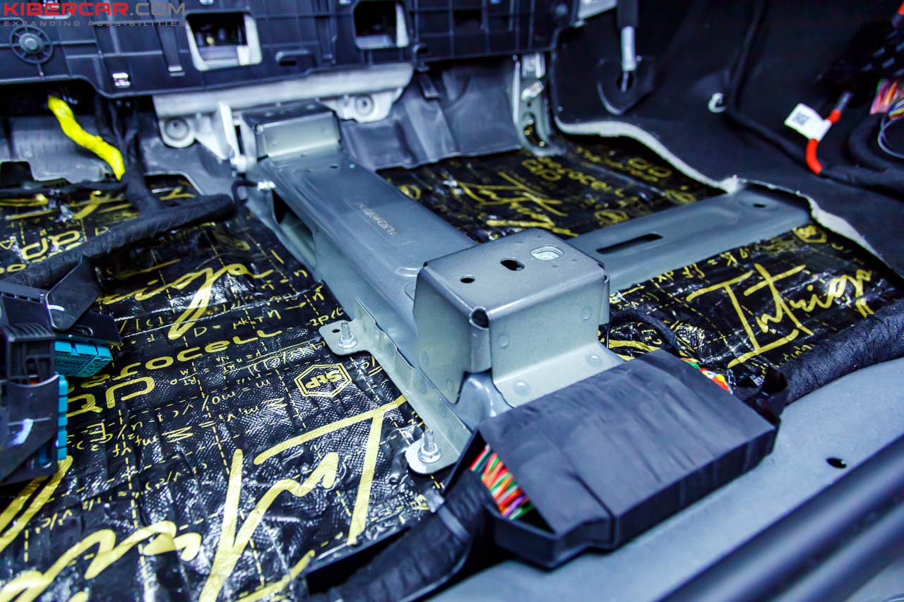 Приступаем к обработке пола. Освободили салон, в передней его части и на внутренних арках наклеили Aerocell QP Intrigo. Для оклейки участка под вторым рядом сидений и багажника использовали Aerocell QP Genio, с похожими свойствами, но тоньше. Вторым слоем уложили NoiseBlock, а в багажнике и под вторым рядом сидений – Bromo.