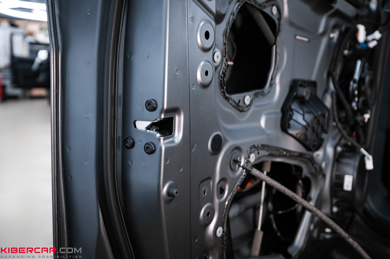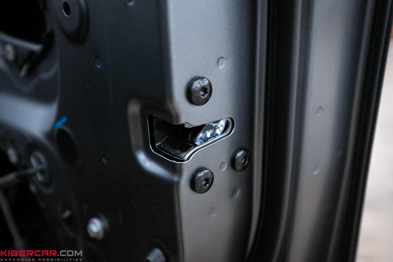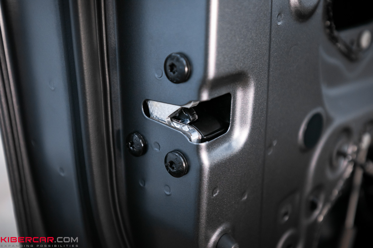 Оригинальный дверной замок немного смещается. Это не влияет на его функциональность: он будет работать так же надежно, как и прежде. Смещение замка позволяет разместить пластину и закрепить доводчик. Замеры мы сделали заранее, так что пластина будет точно соответствовать параметрам конкретной модели авто.