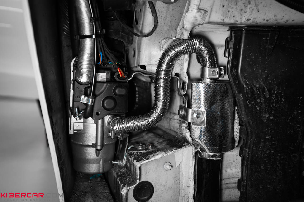 Webasto TT EVO Comfort+ 5 кВ 12 вольт мы установили в моторный отсек, разместив его между передним бампером и колесной нишей. Нарочно выполнили монтаж как можно ниже, чтобы упростить удаление воздуха из циркуляционного насоса и подогревателя. Для фиксации конструкции использовали стандартные и промежуточные кронштейны, а также винты М5 и М6.