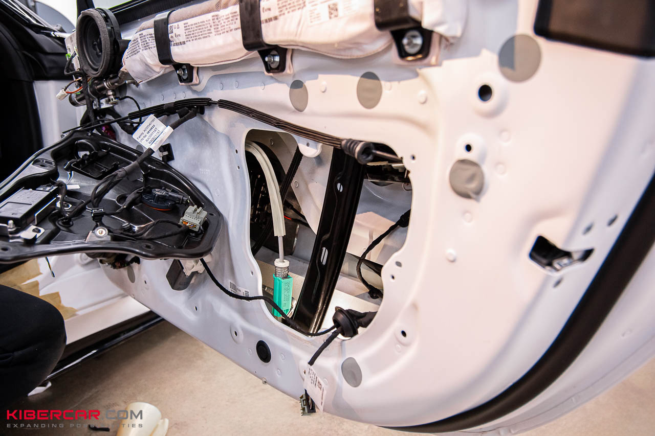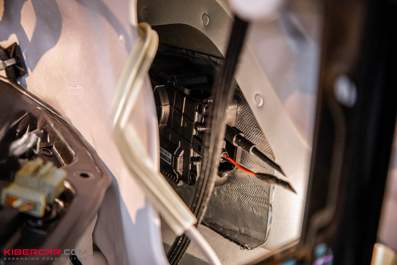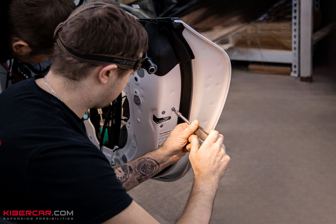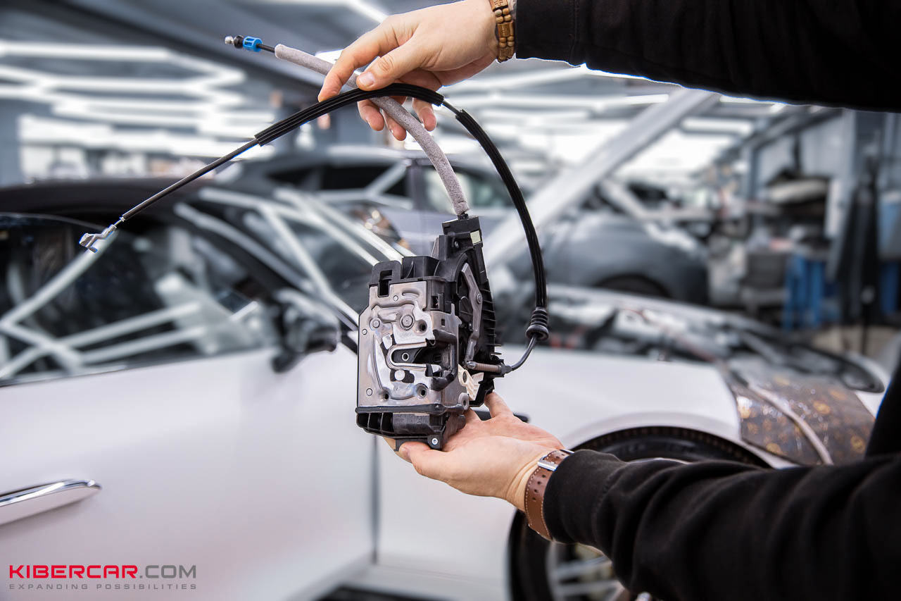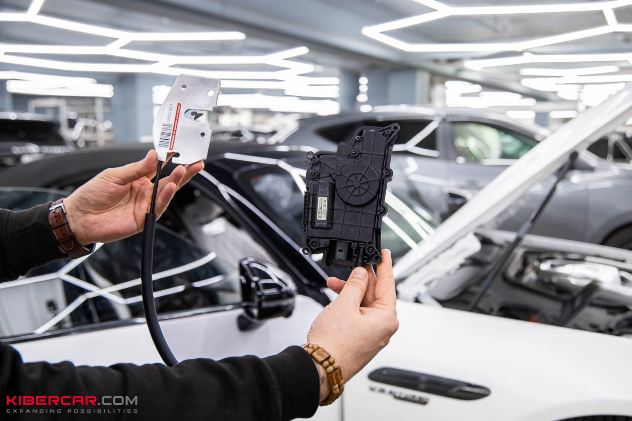 Для установки мы разобрали дверные карты и временно сняли замки. Затем установили пластины, мотор-редукторы и тросы, которые обеспечат питание элемента. Так как комплект доводчиков изготовлен специально для Mercedes-Benz AMG SL 63, удалось использовать штатные отверстия. Чтобы настроить петлю, мы добавили специальную проставку с каждой стороны.