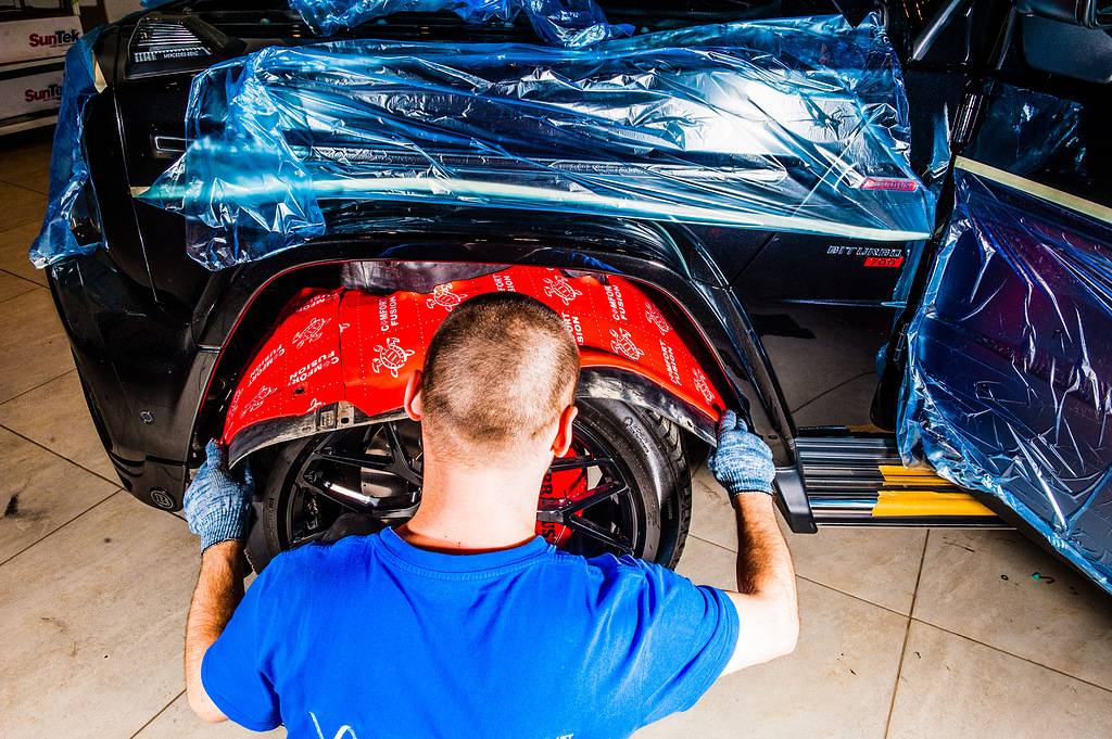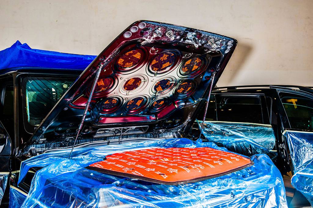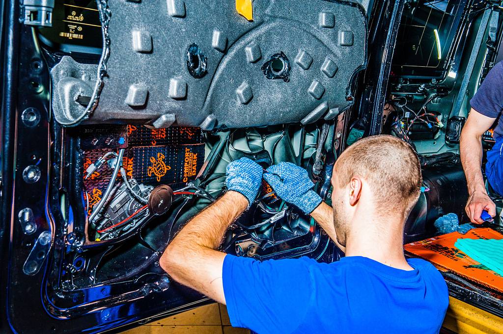 Не менее тщательно мы уложили слой шумовиброизоляции на крышу и пол автомобиля. Если не обработать эти области, возникнет эффект «барабана». Владельцу премиального внедорожника надоело слышать шум от капель дождя и работы выхлопной системы, но ему больше и не придется этого делать – в салоне теперь стало действительно тихо! Это поспособствовала и шумоизоляция дверей.