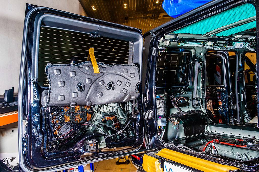 Не менее важна шумоизоляция багажника и его крышки – особенности кузова G-класса приводят к тому, что штатная дверь играет роль «барабана», дополнительно усиливающего дорожные шумы. С теми же целями мы «шумим» двери – к сожалению, характеристики штатной шумоизоляции не столь хороши, как хотелось бы.