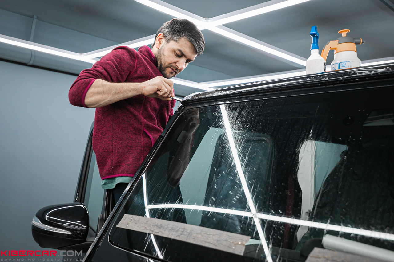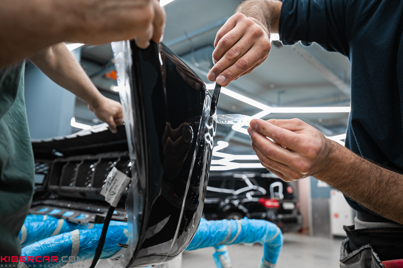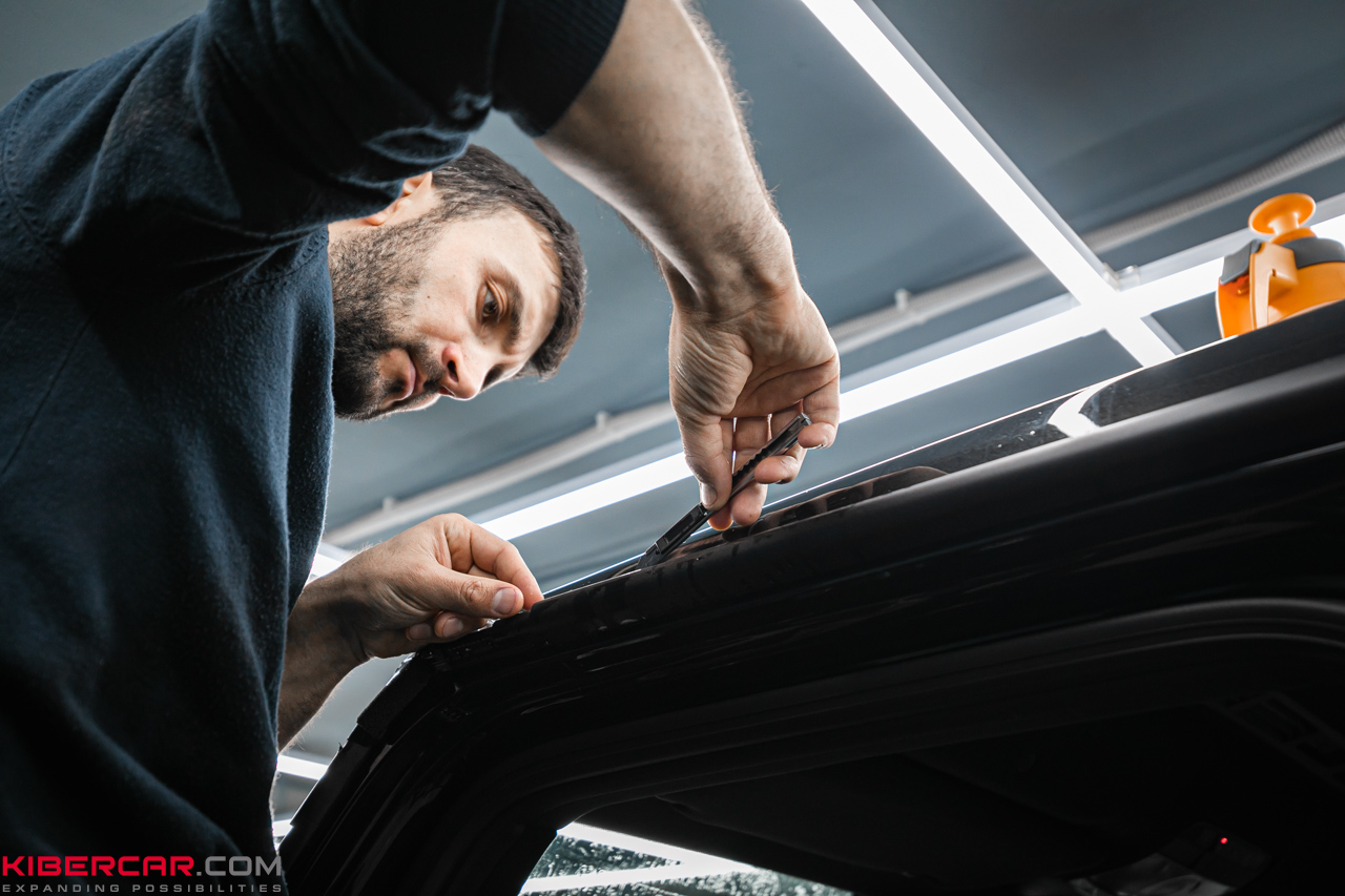 Подгонку пленки мы выполняем непосредственно на кузове. Для этого поверхность лакокрасочного покрытия сбрызгиваем водой, натягиваем пленку и прижимаем к поверхности, после чего выгоняет остатки воздуха. Остатки материала отрезаем острым ножом так, чтобы не повредить ЛКП.