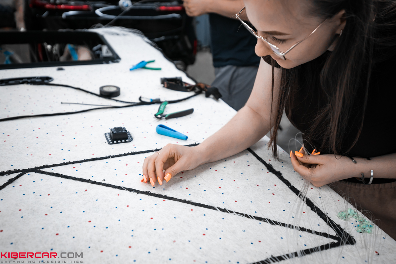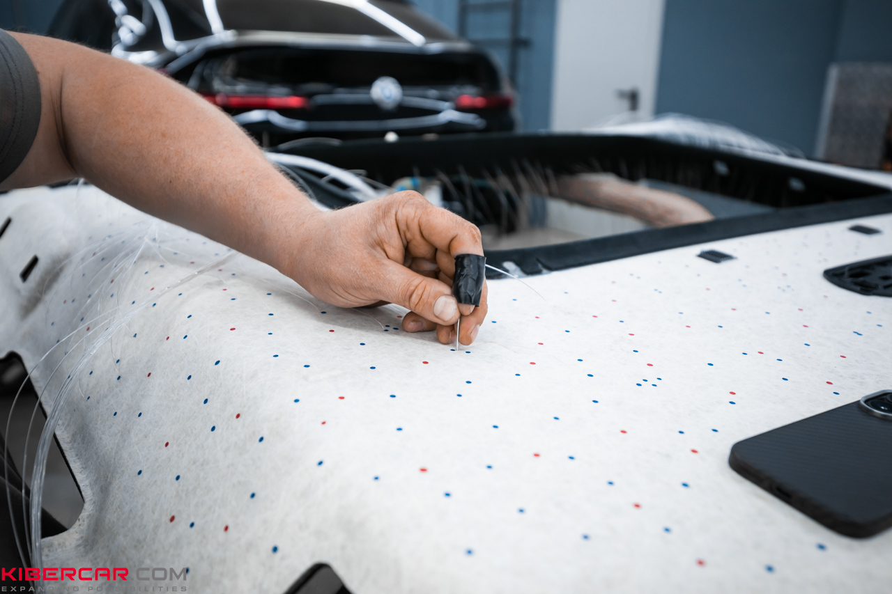 Сначала мы полностью демонтировали потолок: сняли обшивку, чтобы получить доступ к поверхности. Затем мастера определили места для размещения 2000 светодиодных точек и обозначили разметку. После этого установили световые элементы, обтянули потолок алькантарой, чтобы скрыть провода, и вернули на место.