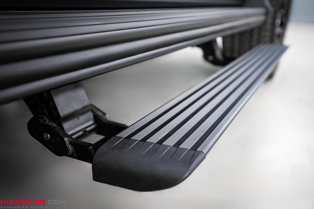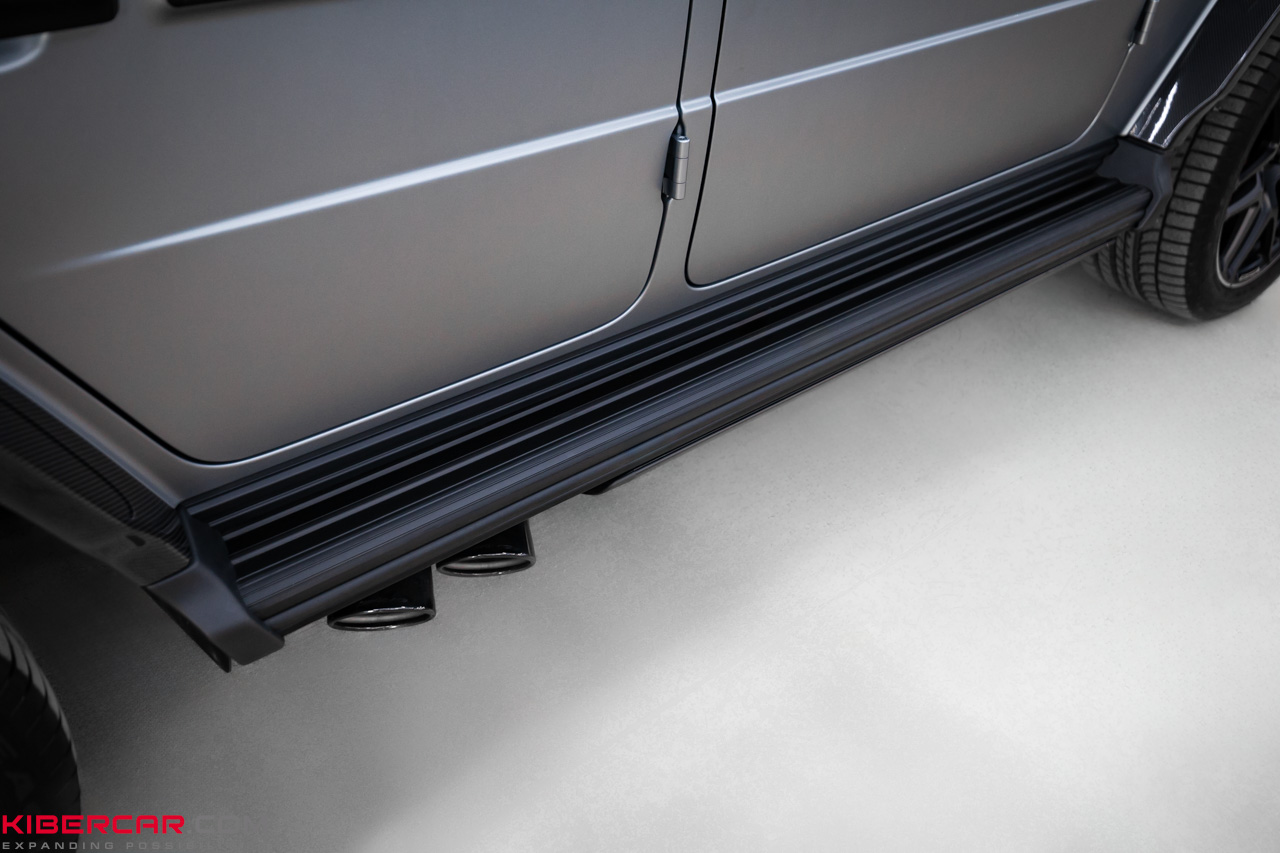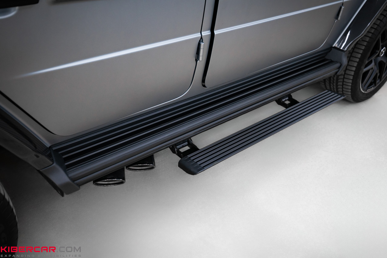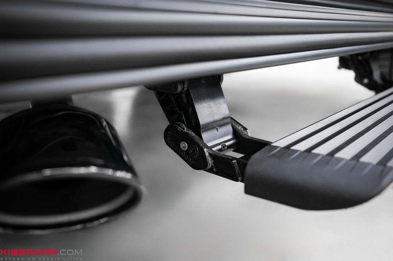 Также мы установили на автомобиль электрические выдвижные пороги. Выбрали укороченную версию, так как в этой модели Gelandewagen сбоку находится выхлопная труба. Планка выезжает вперед каждый раз, когда вы открываете двери.
