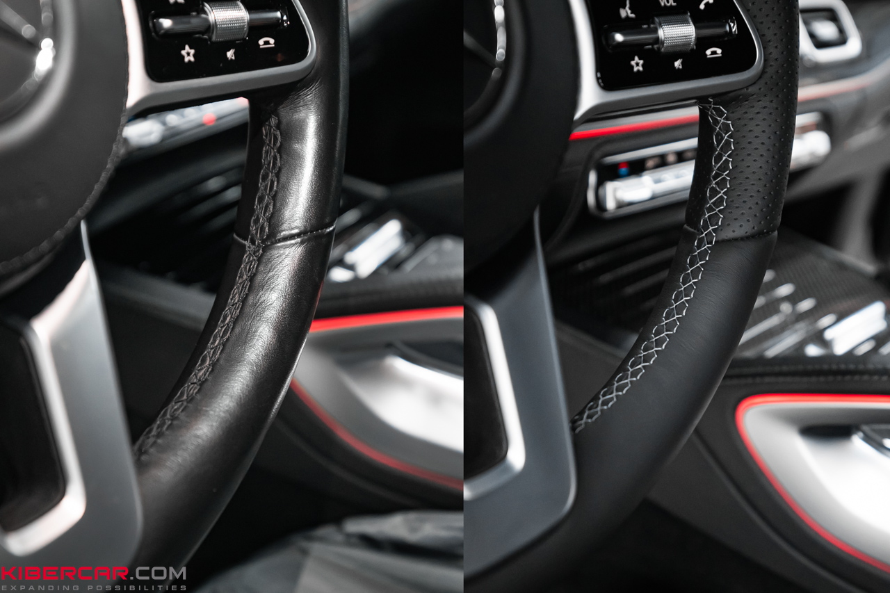 Для начала мы сняли старую отделку и обновили систему подогрева рулевого колеса, чтобы гарантировать отличную работу данной опции. Затем руль был обтянут кожей наппа с дополнительными вставками из перфорированной кожи. Дополнительная деталь – аккуратная строчка, аналогичная заводской, что усилило созданный эффект.