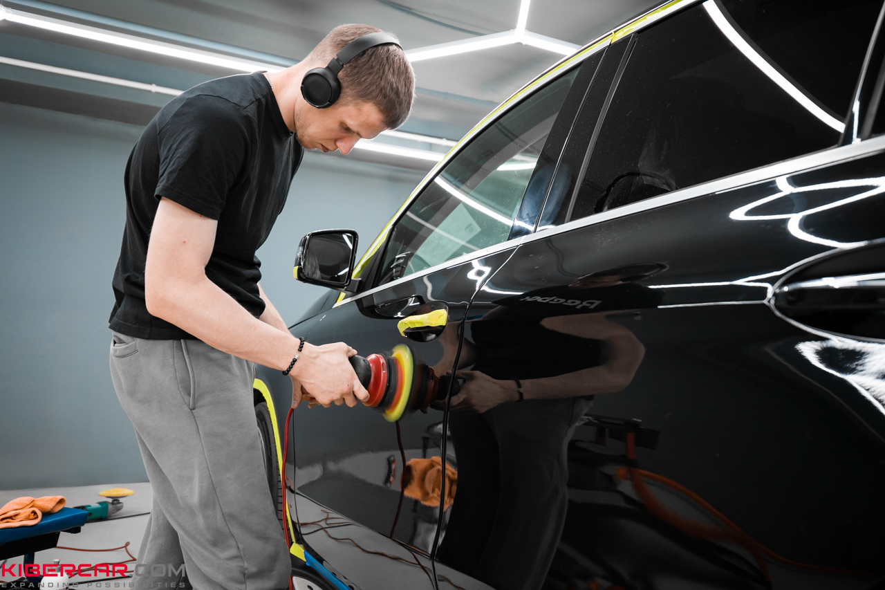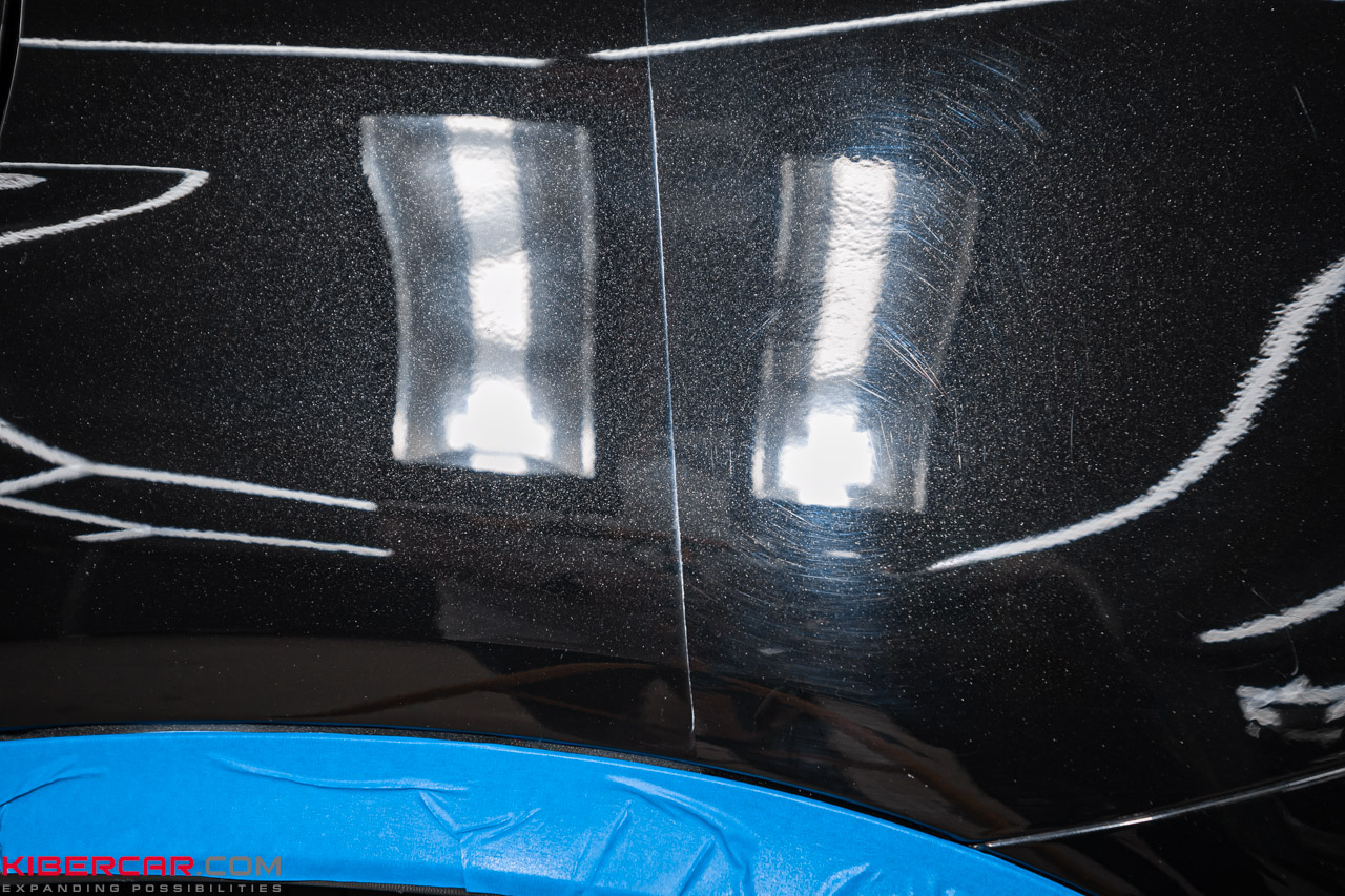 Обсудив с владельцем автомобиля детали заказа, команда приступила к работе. В нашем центре предусмотрен большой набор инструментов, полировальных кругов и паст разной степени абразивности. Перед началом работы мастер осматривает текущее состояние кузова, чтобы определить, какие инструменты и материалы будут оптимальными. Арки и дверные ручки мы оклеили скотчем, чтобы не повредить.