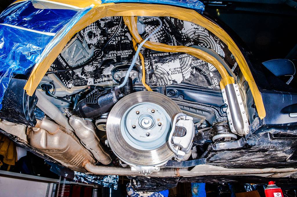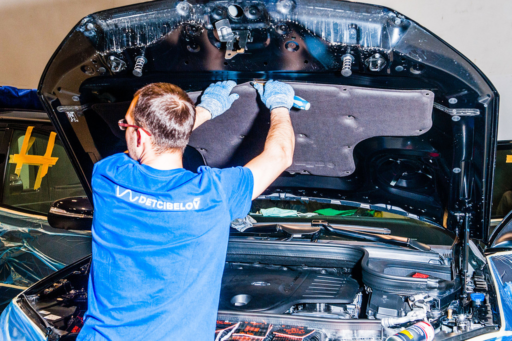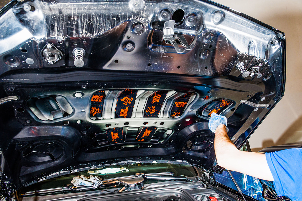 Чтобы полностью устранить посторонние шумы, проводится шумоизоляция дверей, салона, багажного отделения, колесных арок, капота. Такое дооснащение предусматривает демонтаж обшивки, тщательную обработку поверхности элементов с последующей фиксацией шумоизоляционных материалов, у которых для этого есть специальный клеящий слой.