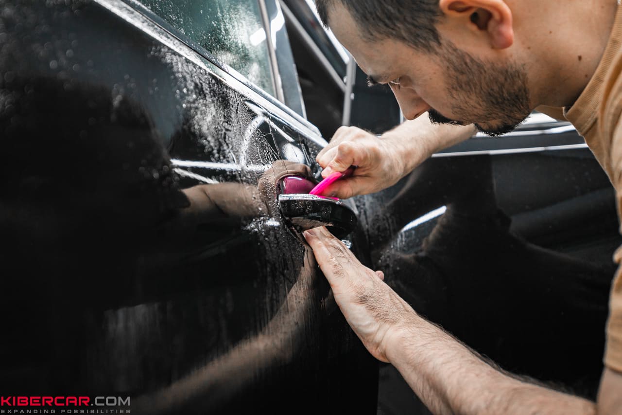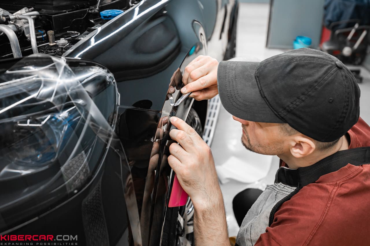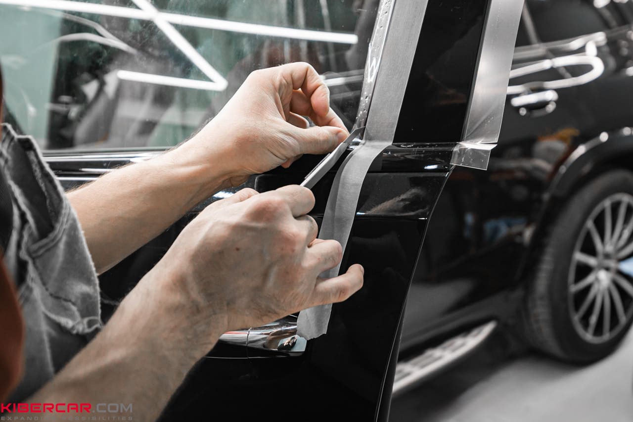 5. Далее мастера поэлементно нарезают пленку, смачивают деталь автомобиля специальным раствором на основе воды и мыла, затем наносят мокрую пленку на поверхность. Пленка должна быть немного больше детали, чтобы ее можно было натянуть, аккуратно подрезать и загнуть по краям. Это обязательное условие, поскольку каждый элемент должен быть «с подворотом», чтобы обеспечить надежную фиксацию пленки на много лет вперёд. Мастера компании КИБЕРКАР режут плёнку не касаясь металла, ведь если резать иначе, можно повредить ЛКП и резиновые уплотнители, испортить покрытие вплоть до перекраса.