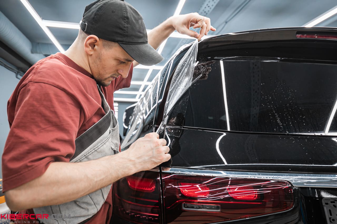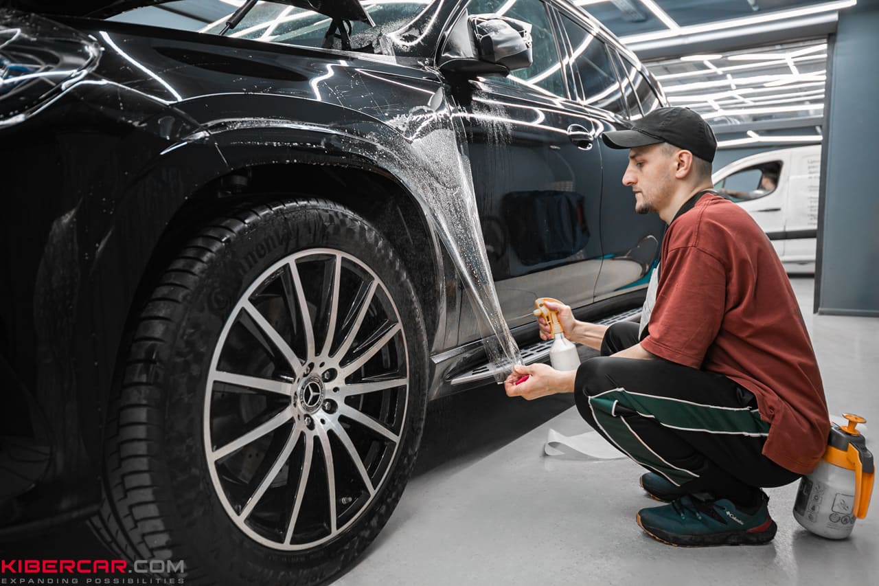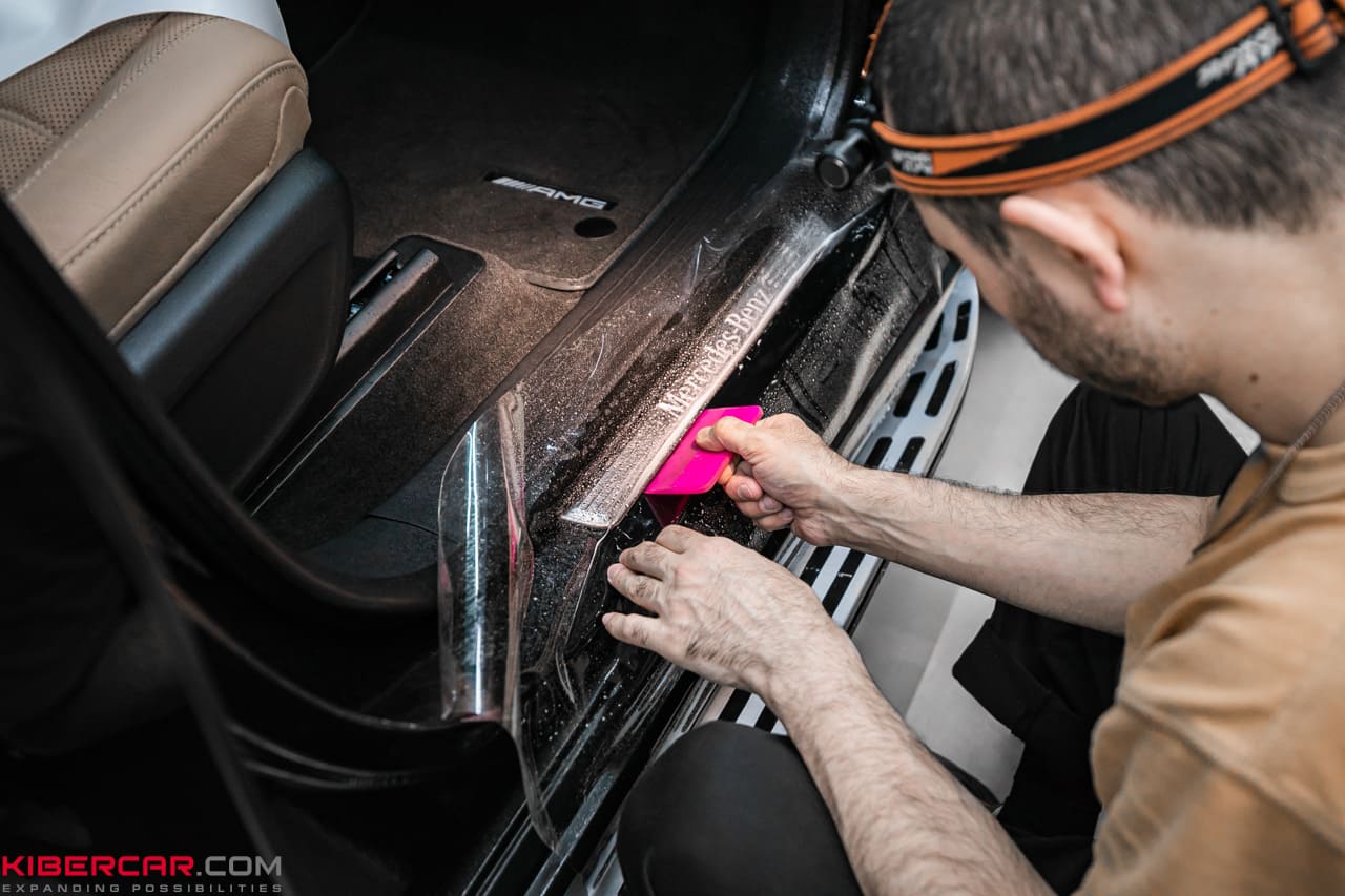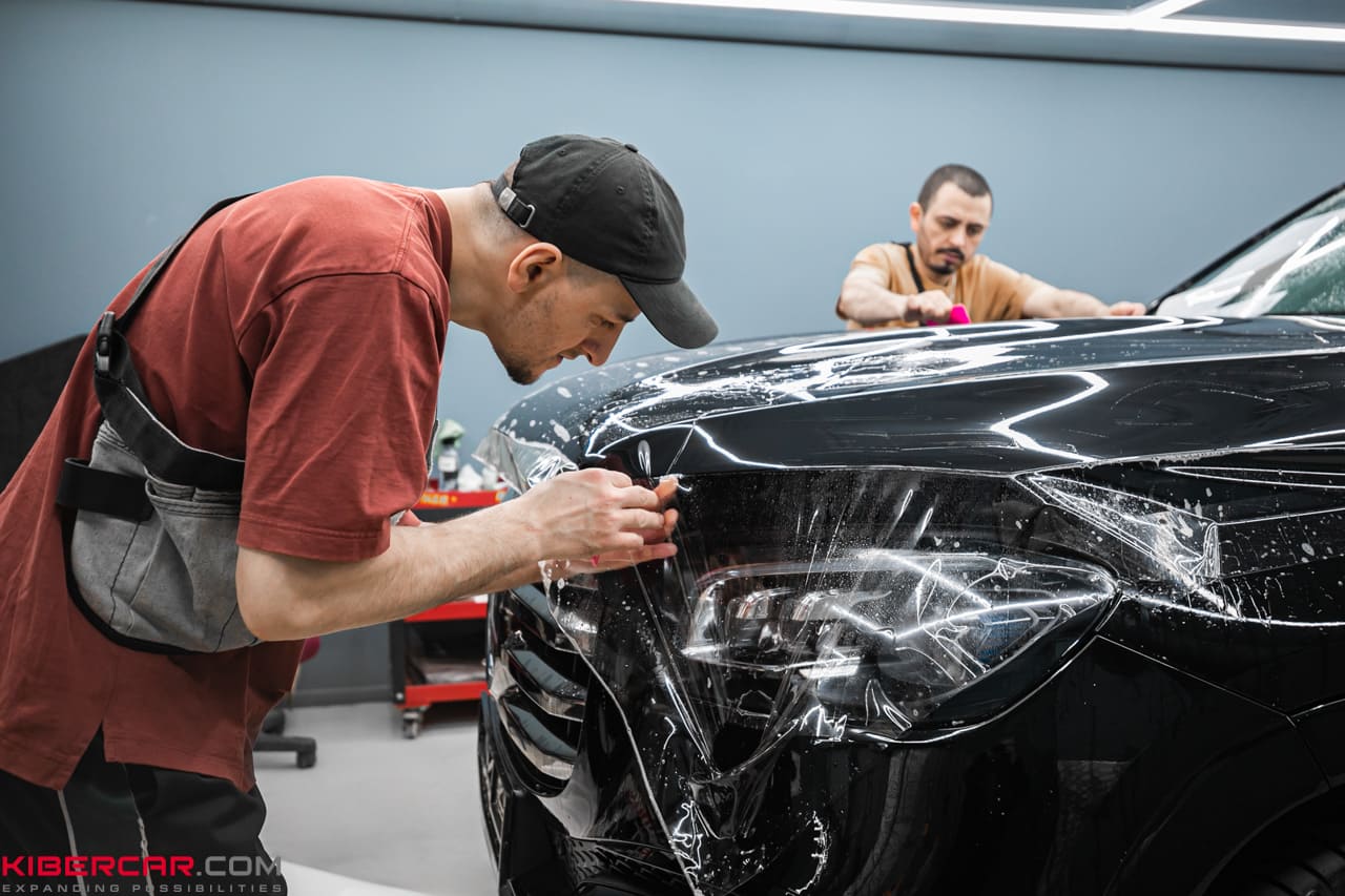 5. Далее мастера поэлементно нарезают пленку, смачивают деталь автомобиля специальным раствором на основе воды и мыла, затем наносят мокрую пленку на поверхность. Пленка должна быть немного больше детали, чтобы ее можно было натянуть, аккуратно подрезать и загнуть по краям. Это обязательное условие, поскольку каждый элемент должен быть «с подворотом», чтобы обеспечить надежную фиксацию пленки на много лет вперёд. Мастера компании КИБЕРКАР режут плёнку не касаясь металла, ведь если резать иначе, можно повредить ЛКП и резиновые уплотнители, испортить покрытие вплоть до перекраса.