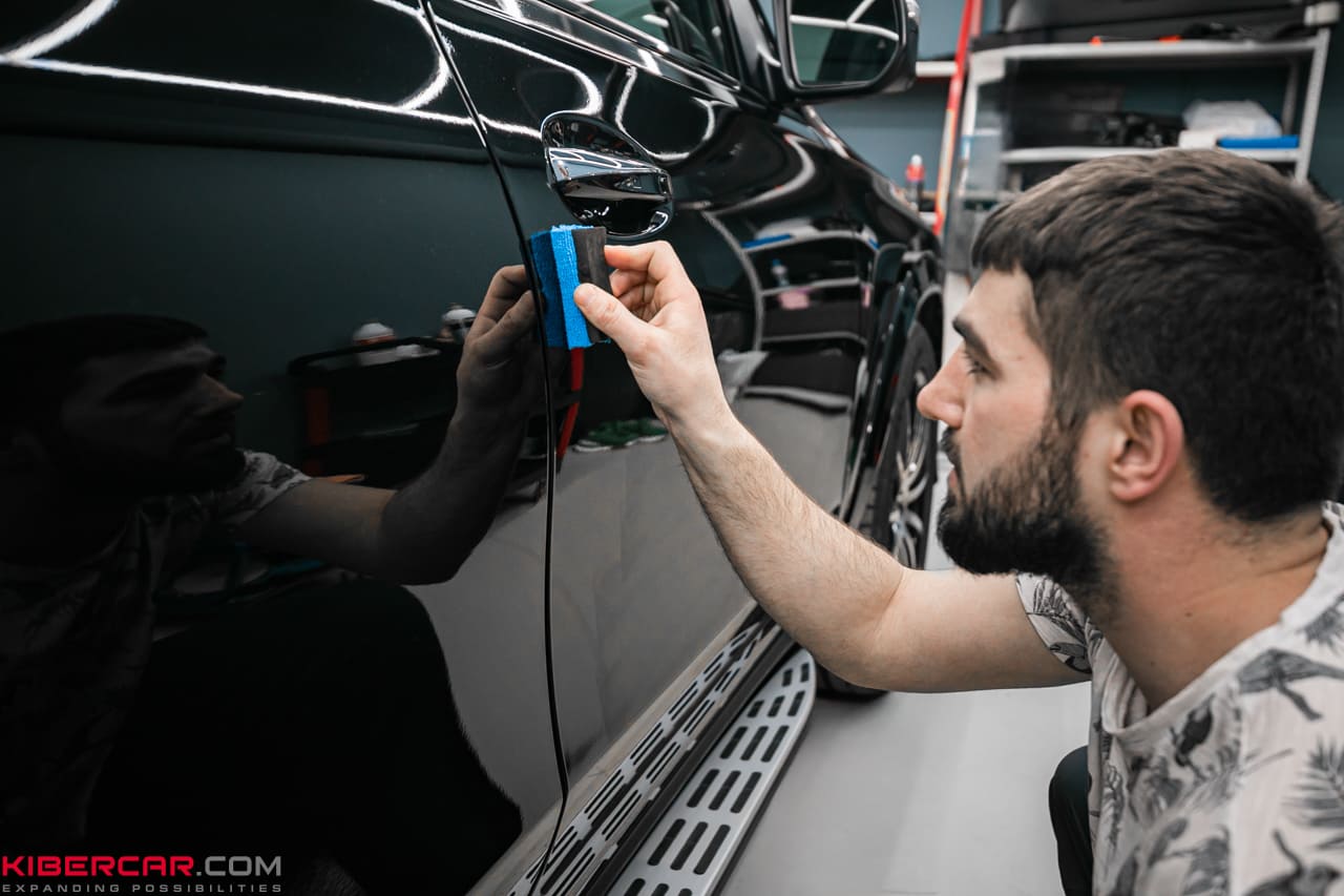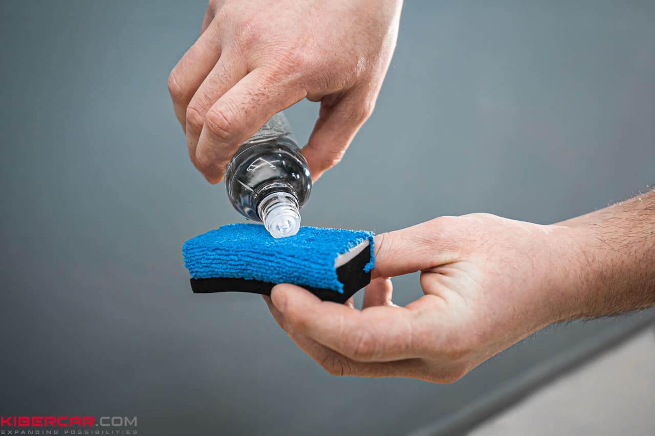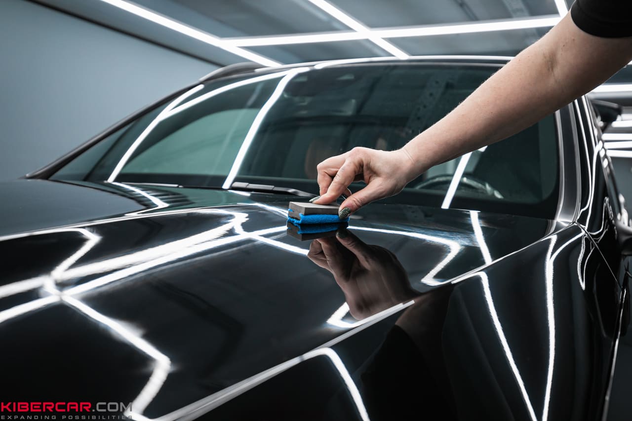 По окончании полировки приступили к нанесению керамического покрытия. Оно защитит ЛКП автомобиля от атмосферных осадков, механических повреждений и других негативных факторов. Керамику наносим на поверхность при помощи специальных губок и кистей, затем оставляем высыхать и наносим еще несколько слоев.