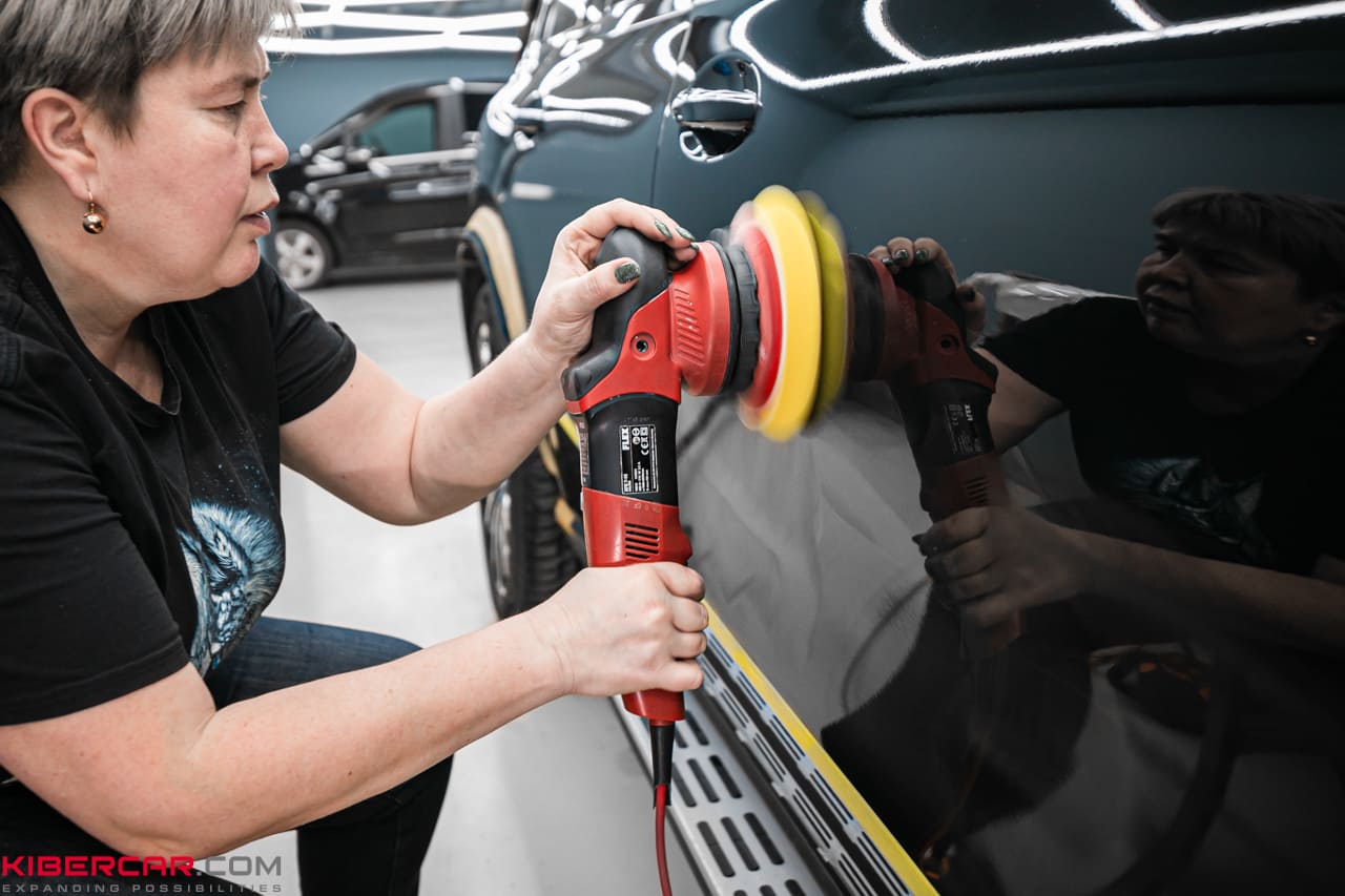 Для обработки кузова использовали несколько видов полировальных машин и составов. Такой подход позволяет удалить царапины разной глубины, не повредив лакокрасочное покрытие. Команда давно занимается детейлингом, поэтому точно контролирует степень нажима, скорость работы машинки и другие параметры. Полировка выполняется постепенно, шаг за шагом. Каждый участок мы внимательно осматриваем, и если царапин не осталось, переходим к следующему.