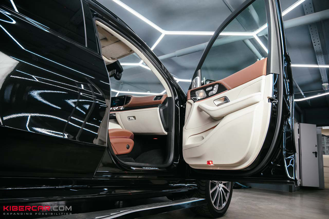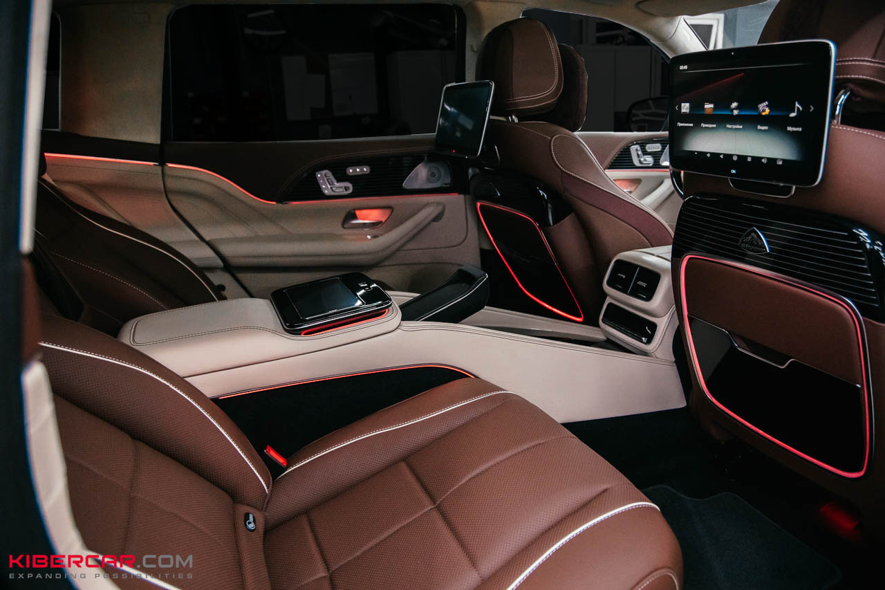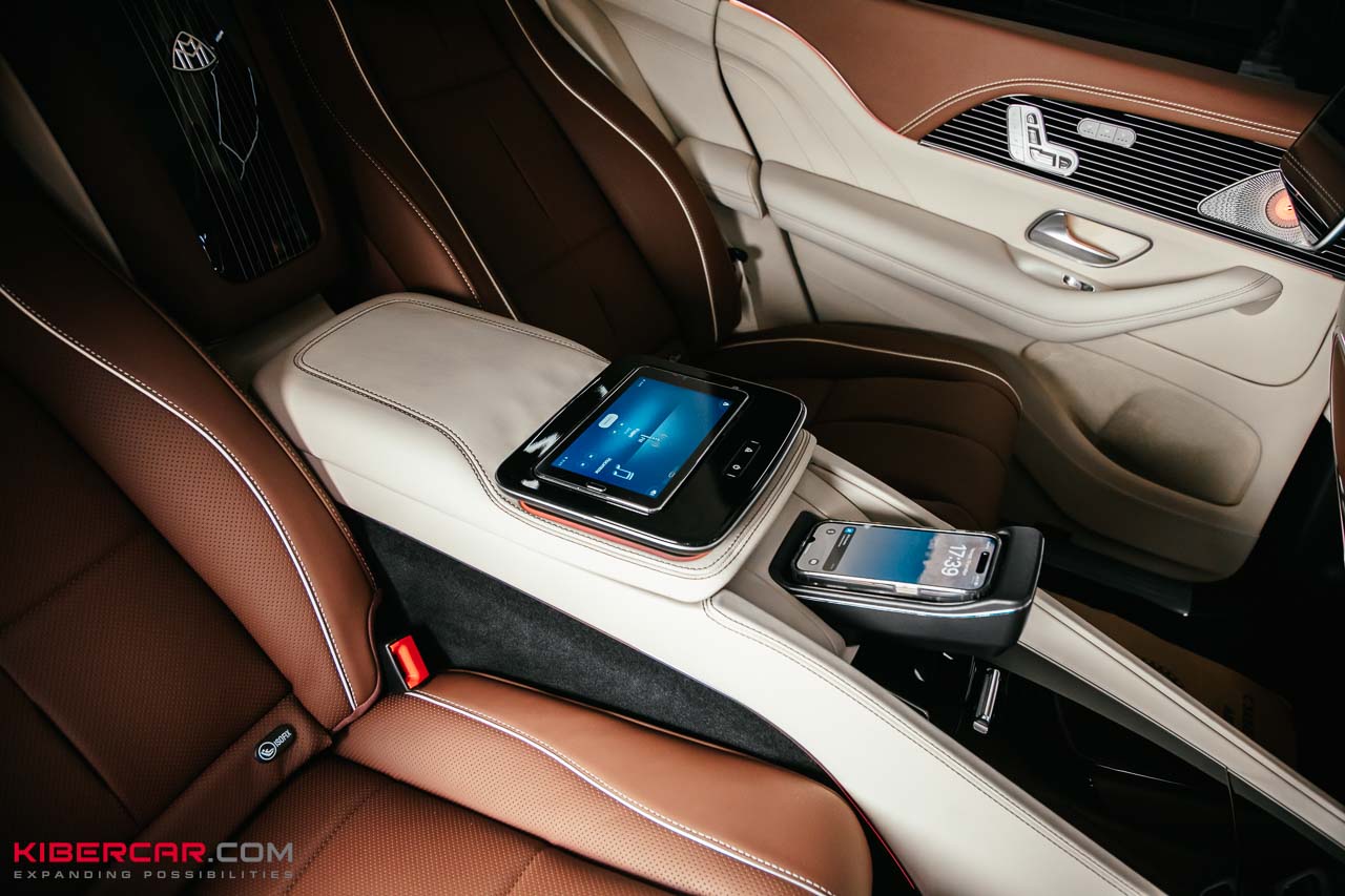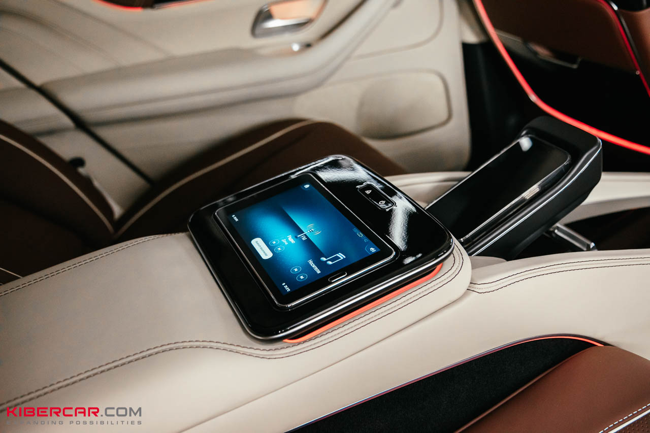 Также добавили ряд элементов, которые есть в Mercedes-Benz Maybach, но отсутствуют в Mercedes-Benz GLS: дополнительные кнопки управления, шильдики с фирменной надписью, длинную центральную торпеду. После дооснащения водитель получил возможность управлять мультимедийным блоком при помощи планшета.