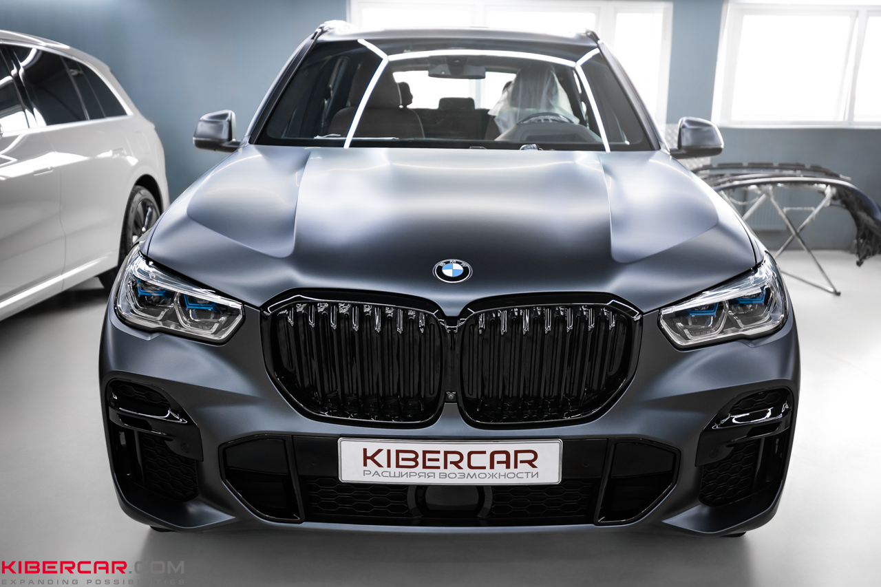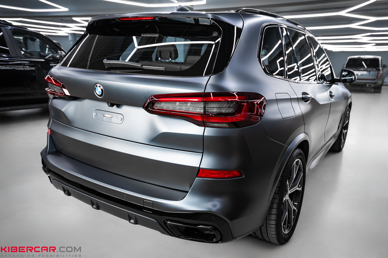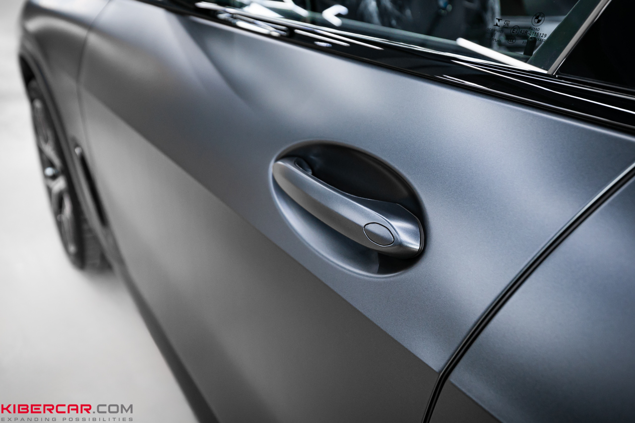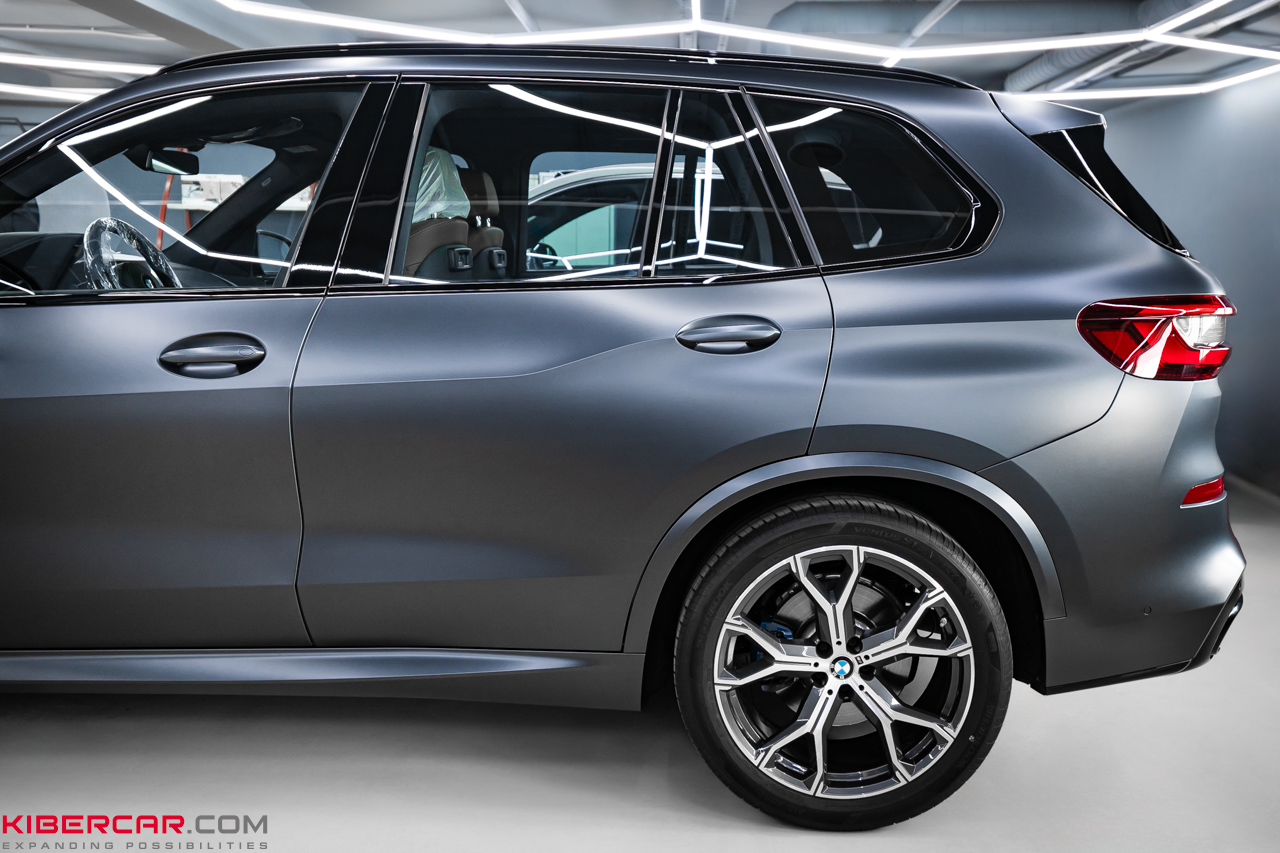 Матовая фактура визуально "приглушает" глянец, делает кузов более собранным, подчеркивает силуэт и рельефные линии BMW X5. В сочетании с затемненными хромированными элементами внешний вид автомобиля стал по-настоящему цельным и харизматичным.