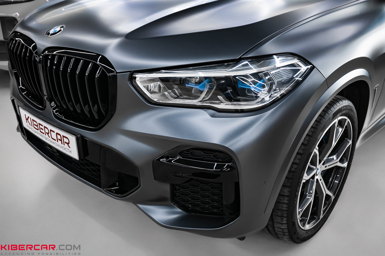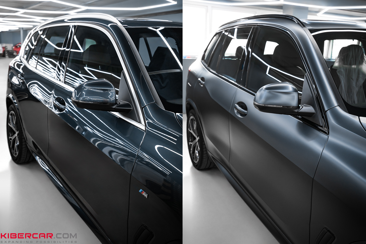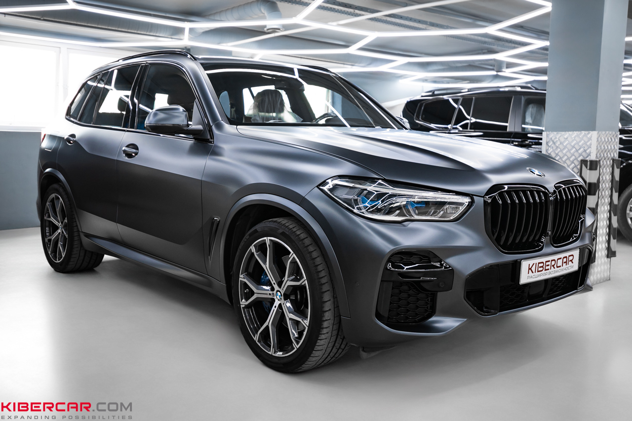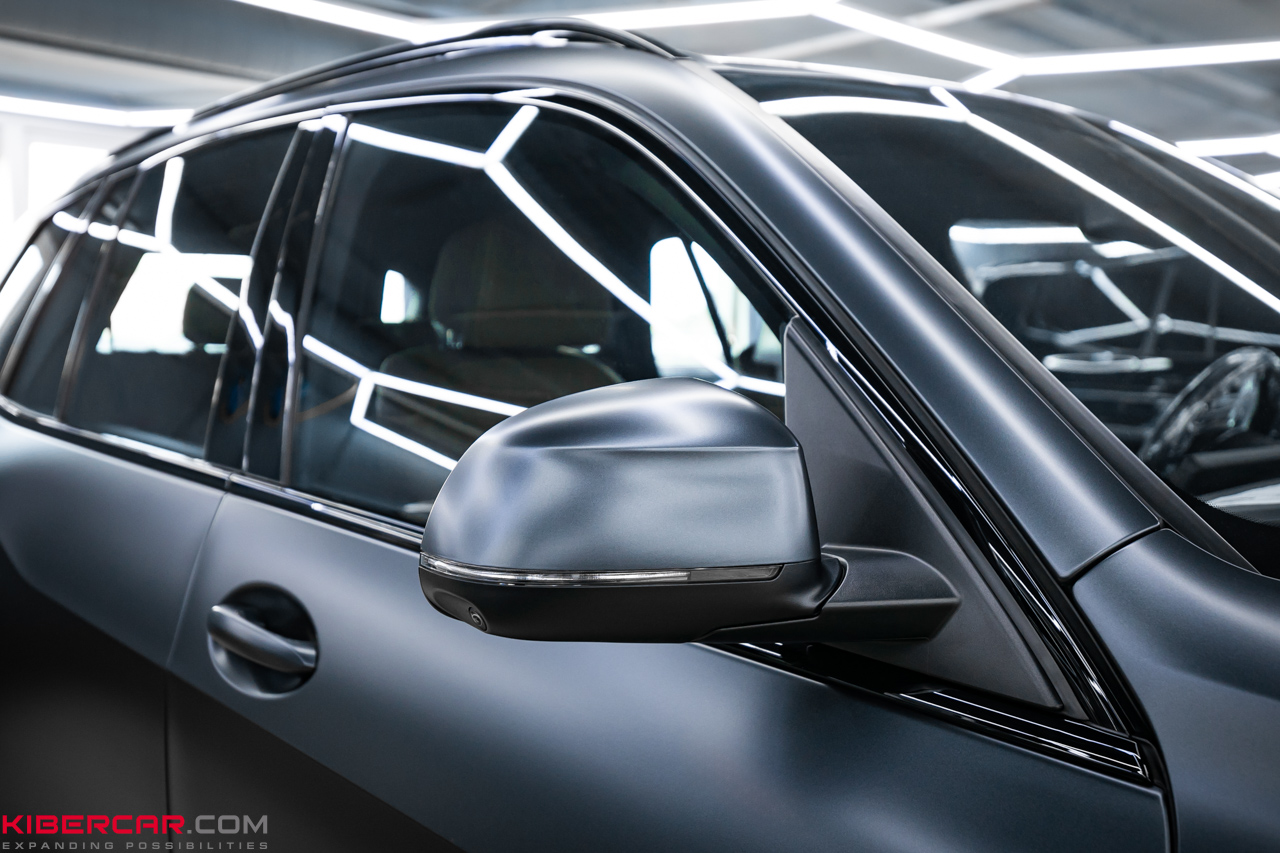 Матовая фактура визуально "приглушает" глянец, делает кузов более собранным, подчеркивает силуэт и рельефные линии BMW X5. В сочетании с затемненными хромированными элементами внешний вид автомобиля стал по-настоящему цельным и харизматичным.