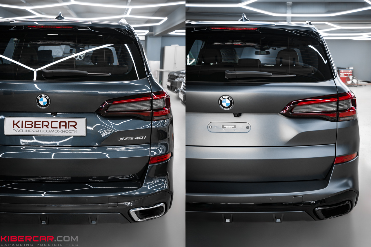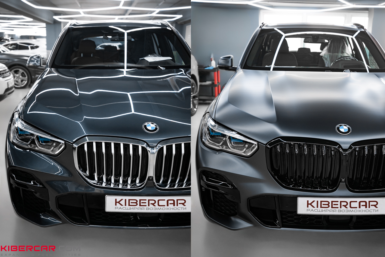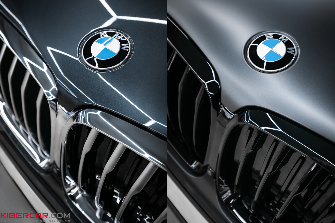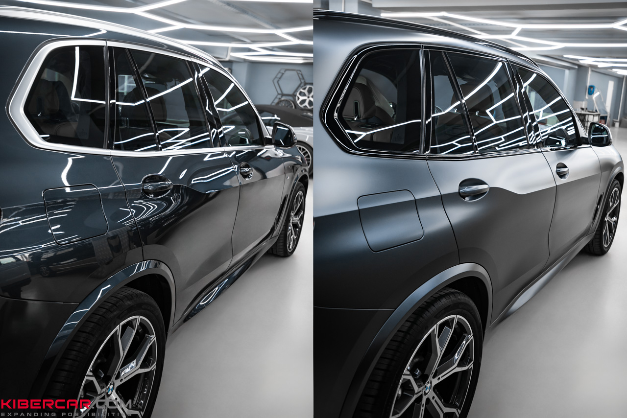 Матовая фактура визуально "приглушает" глянец, делает кузов более собранным, подчеркивает силуэт и рельефные линии BMW X5. В сочетании с затемненными хромированными элементами внешний вид автомобиля стал по-настоящему цельным и харизматичным.