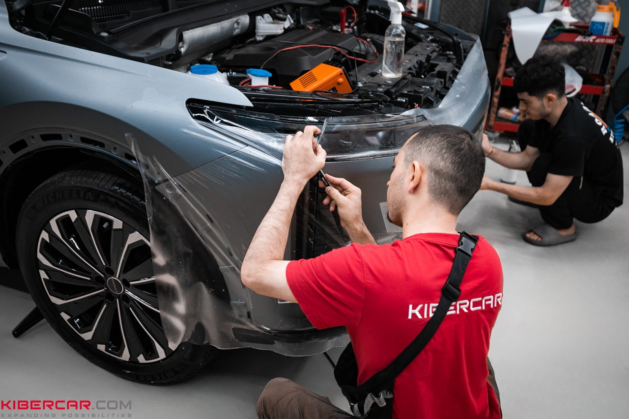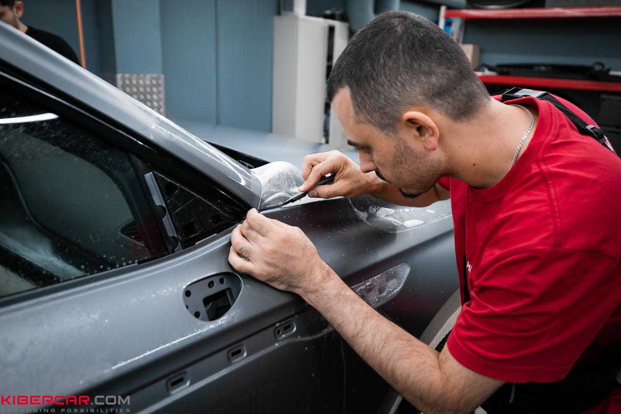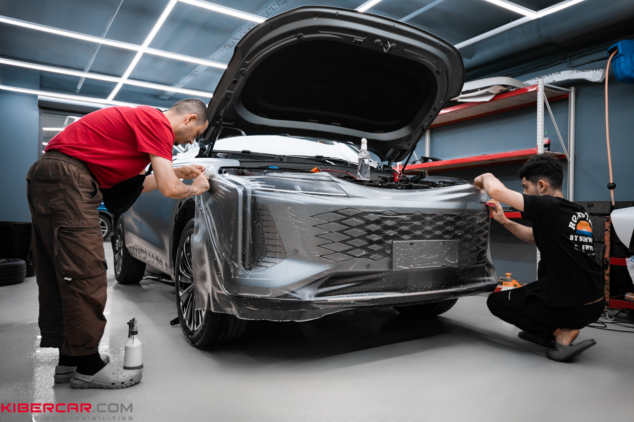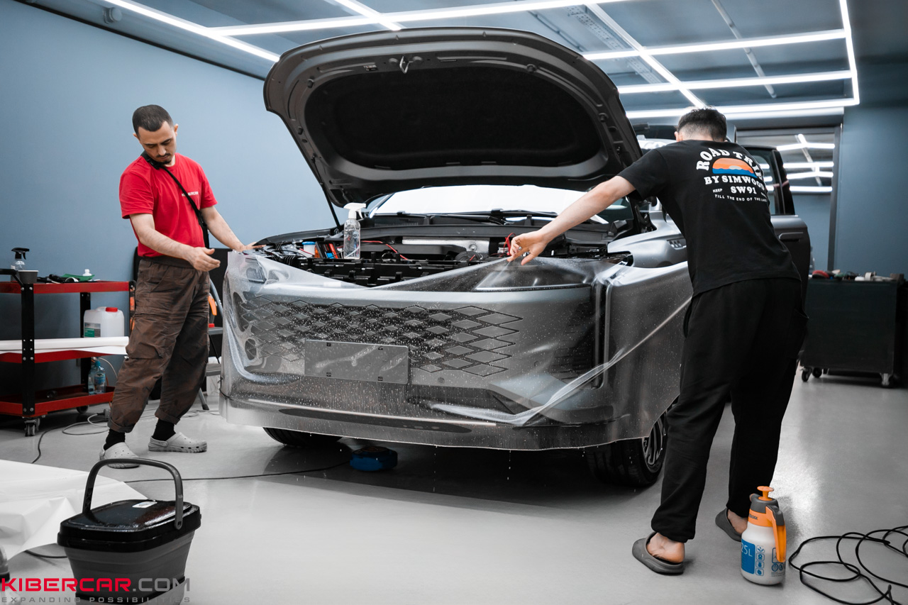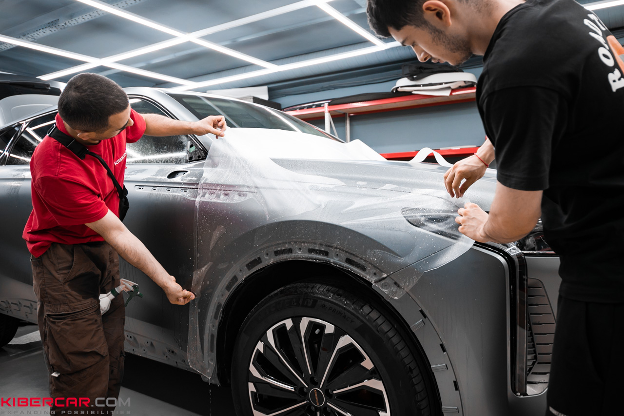 Нанесение пленки. Оклейка пленкой это высокотехнологичный процесс, который требует предельной точности и аккуратности. Наши мастера используют только профессиональные инструменты и материалы, что позволяет избежать пузырей и складок на поверхности. Каждый элемент автомобиля был оклеен с учетом его геометрии, чтобы обеспечить максимальную защиту и эстетичный вид.