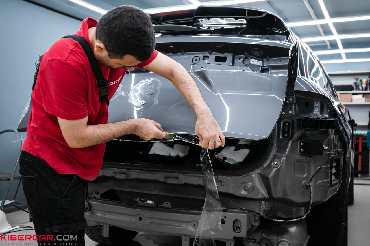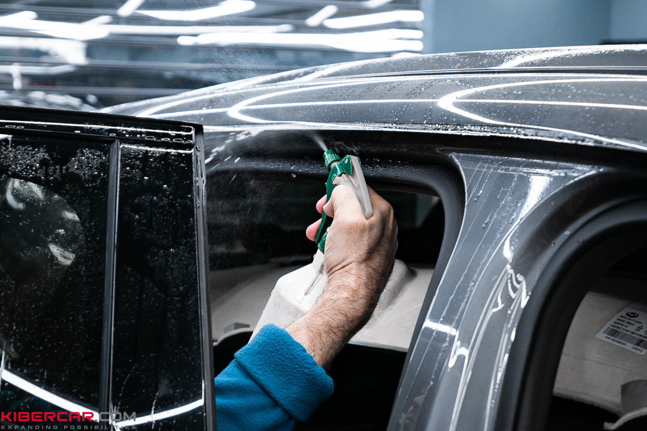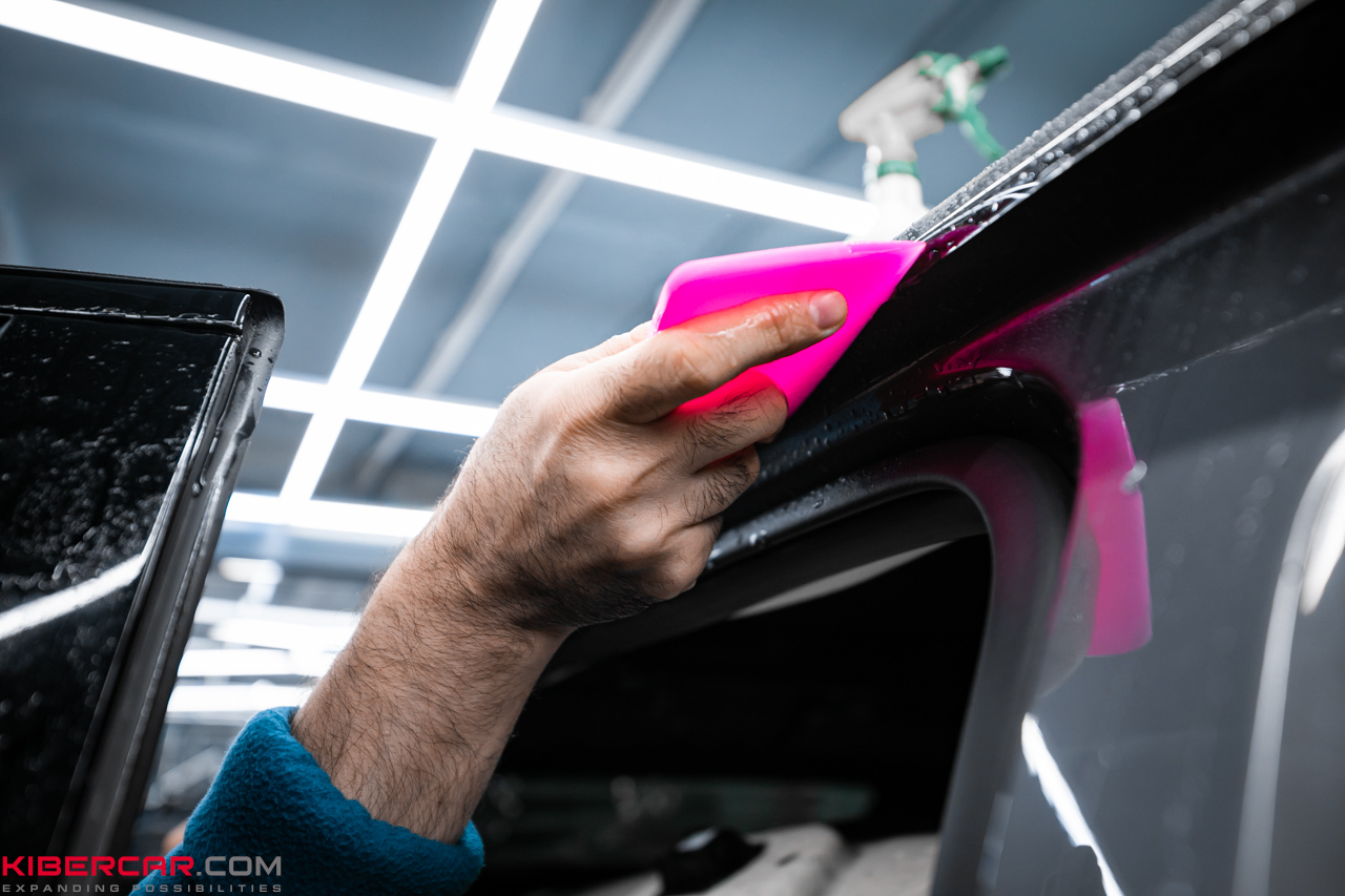 Подготовка кузова. Как и для любого процесса оклейки, мы начали с тщательной мойки автомобиля, чтобы удалить даже мельчайшие частицы грязи. Затем провели обезжиривание кузова и легкую полировку для устранения микротрещин и неровностей, чтобы обеспечить идеальную адгезию пленки.