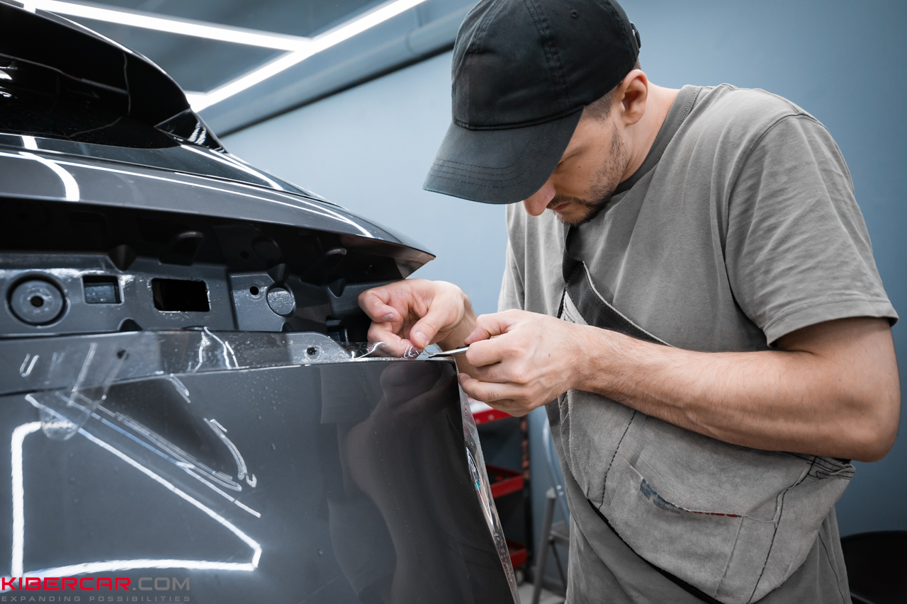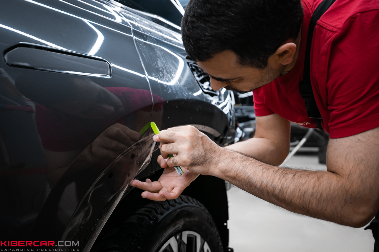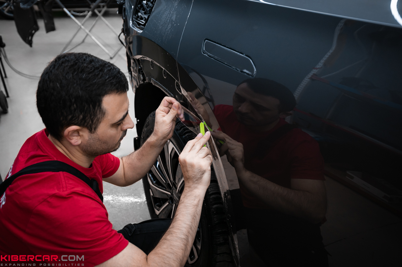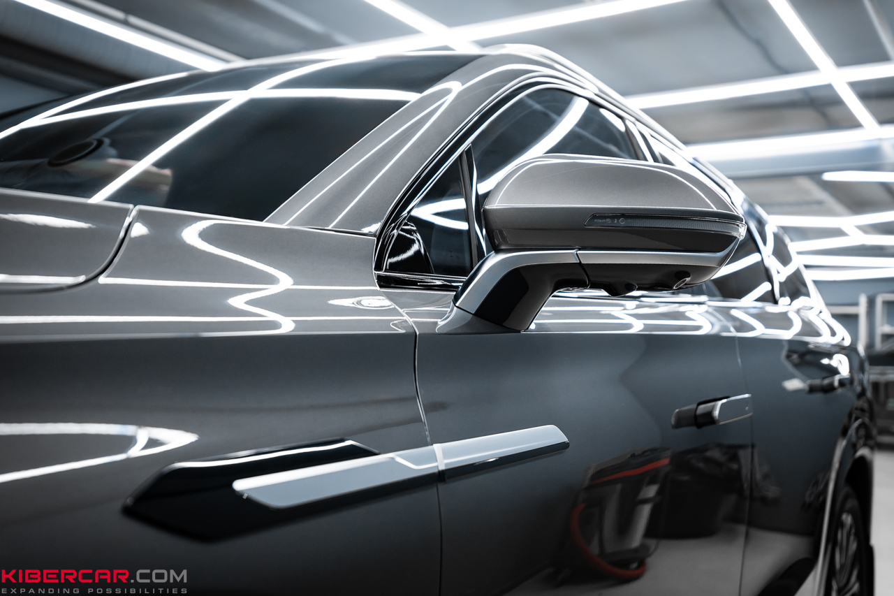 Подготовка кузова. Как и для любого процесса оклейки, мы начали с тщательной мойки автомобиля, чтобы удалить даже мельчайшие частицы грязи. Затем провели обезжиривание кузова и легкую полировку для устранения микротрещин и неровностей, чтобы обеспечить идеальную адгезию пленки.