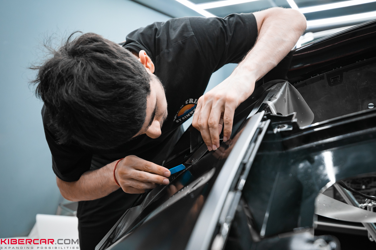 Когда автомобиль прибыл, мы обсудили с клиентом варианты защиты и стайлинга. Стандартная оклейка полиуретановой пленкой защищает автомобиль от мелких повреждений, реагентов, насекомых и липы, а антихром позволяет преобразить внешний вид, избавив детали от хромированного напыления, которое со временем может помутнеть. Мы предложили интересную идею: сочетать матовую и глянцевую полиуретановую пленку в одном проекте.