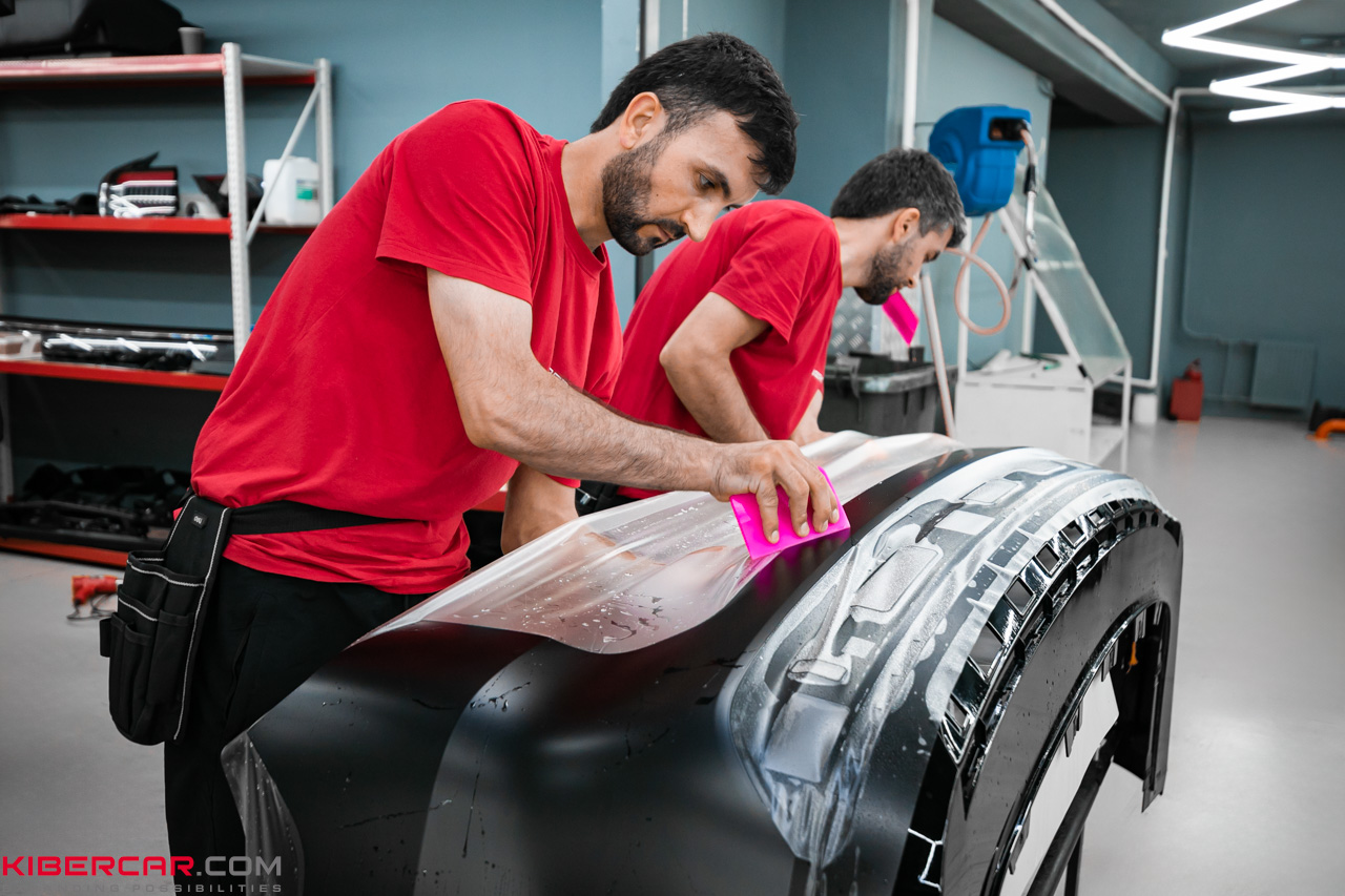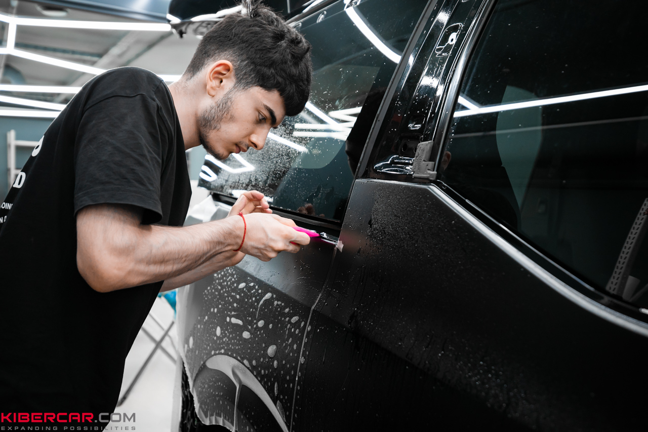 Черные глянцевые акценты отлично сочетаются с матовой пленкой на основных частях кузова, создавая впечатляющий контраст. Такой способ антихрома является самым долговечным и устойчивым к внешним воздействиям, что делает его идеальным выбором для клиентов, ценящих надежность и стиль.