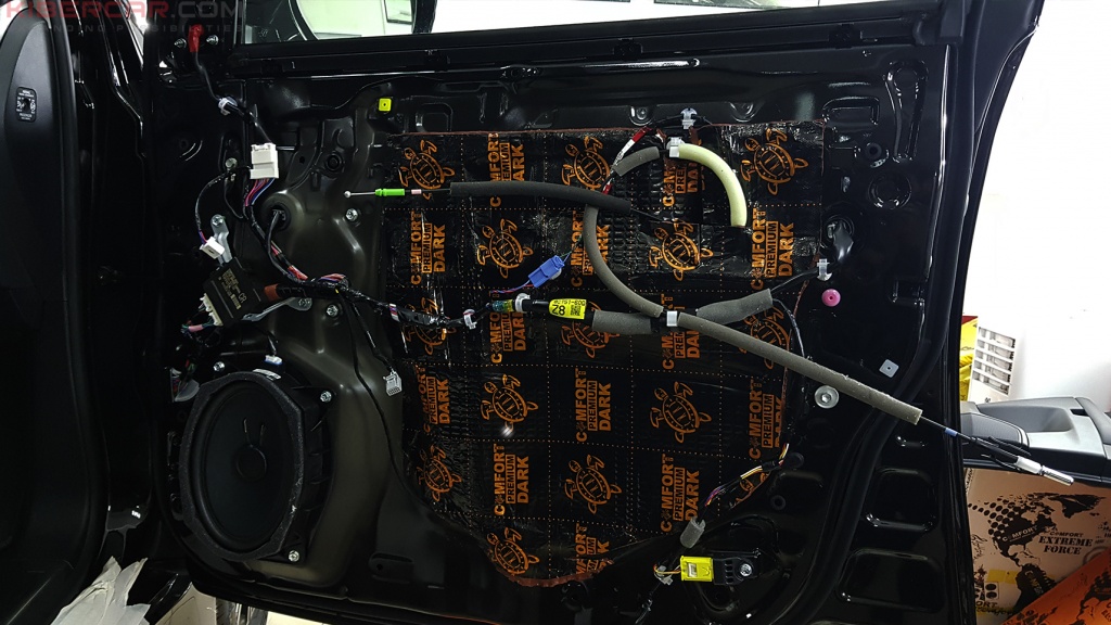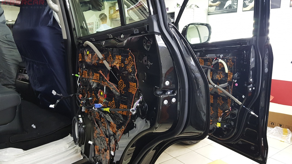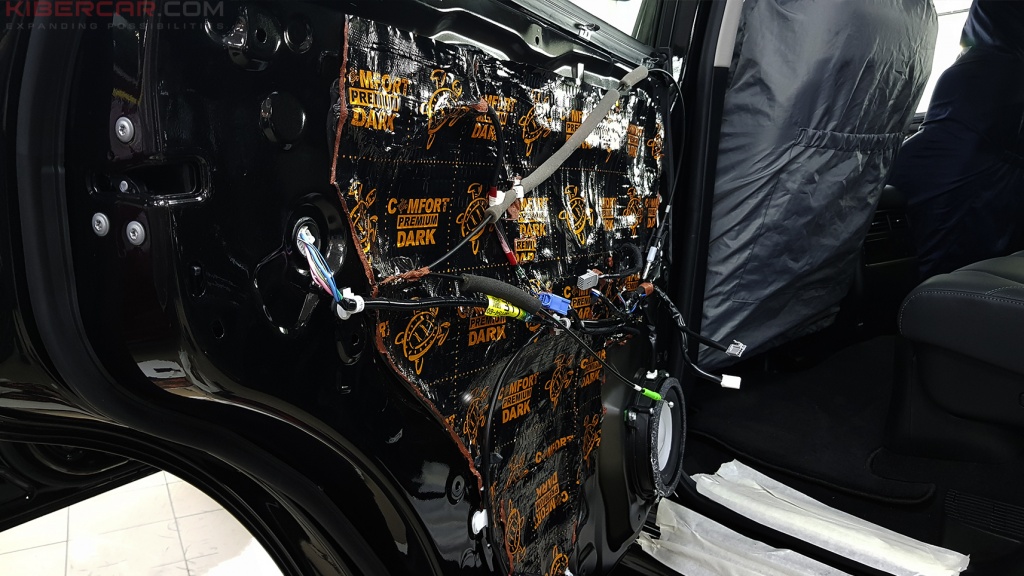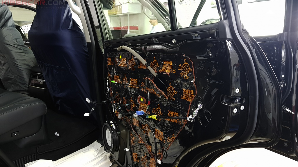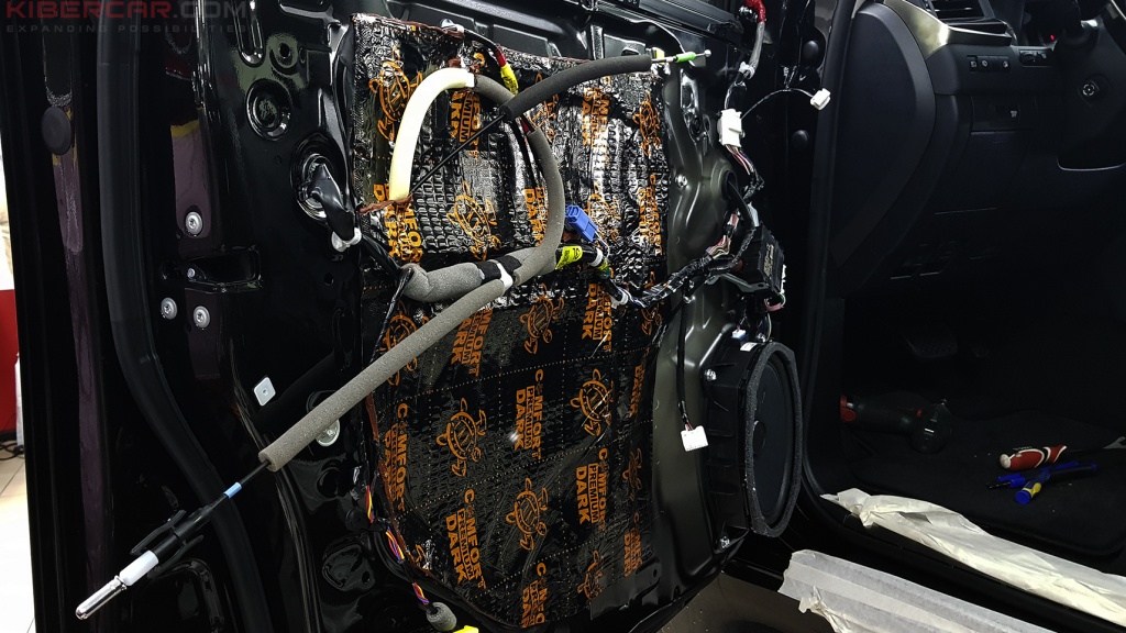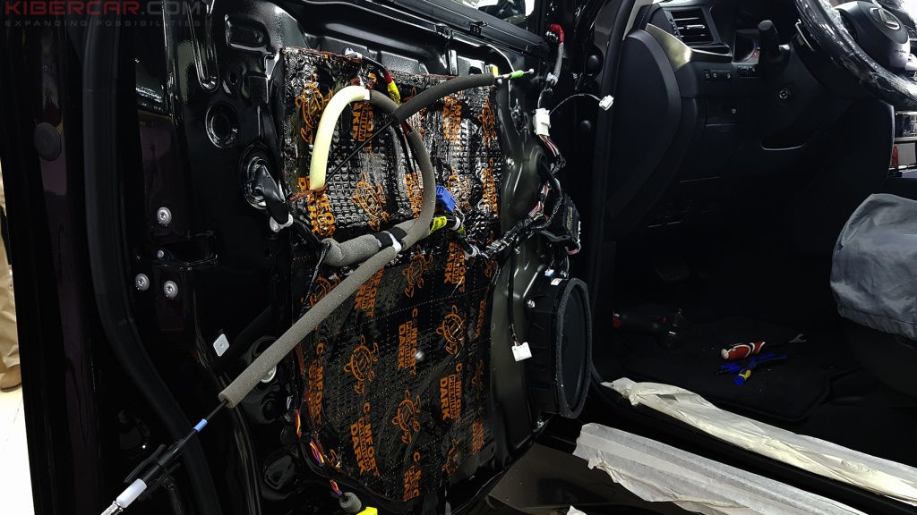 Процесс шумо- виброизоляции проходит в три этапа. Первым слоем мы наложили виброизоляционное покрытие Comfort Mat Dark, защищающий от вибраций кузова под воздействием аэродинамических завихрений или, к примеру, от громко работающего двигателя. Далее последовал слой виброизоляции технических отверстий и каркаса двери. И в конце, удалив, штатную шумоизоляции, мы нанесли шумопоглощающий слой Ultra Soft от той же фирмы. Таким образом, данный Lexus обрел постоянство тишины в салоне.
