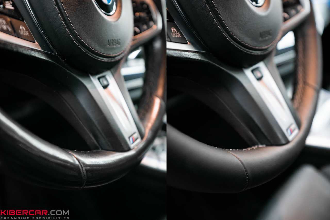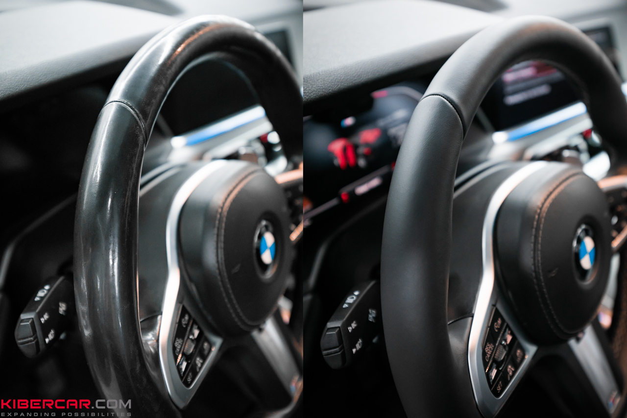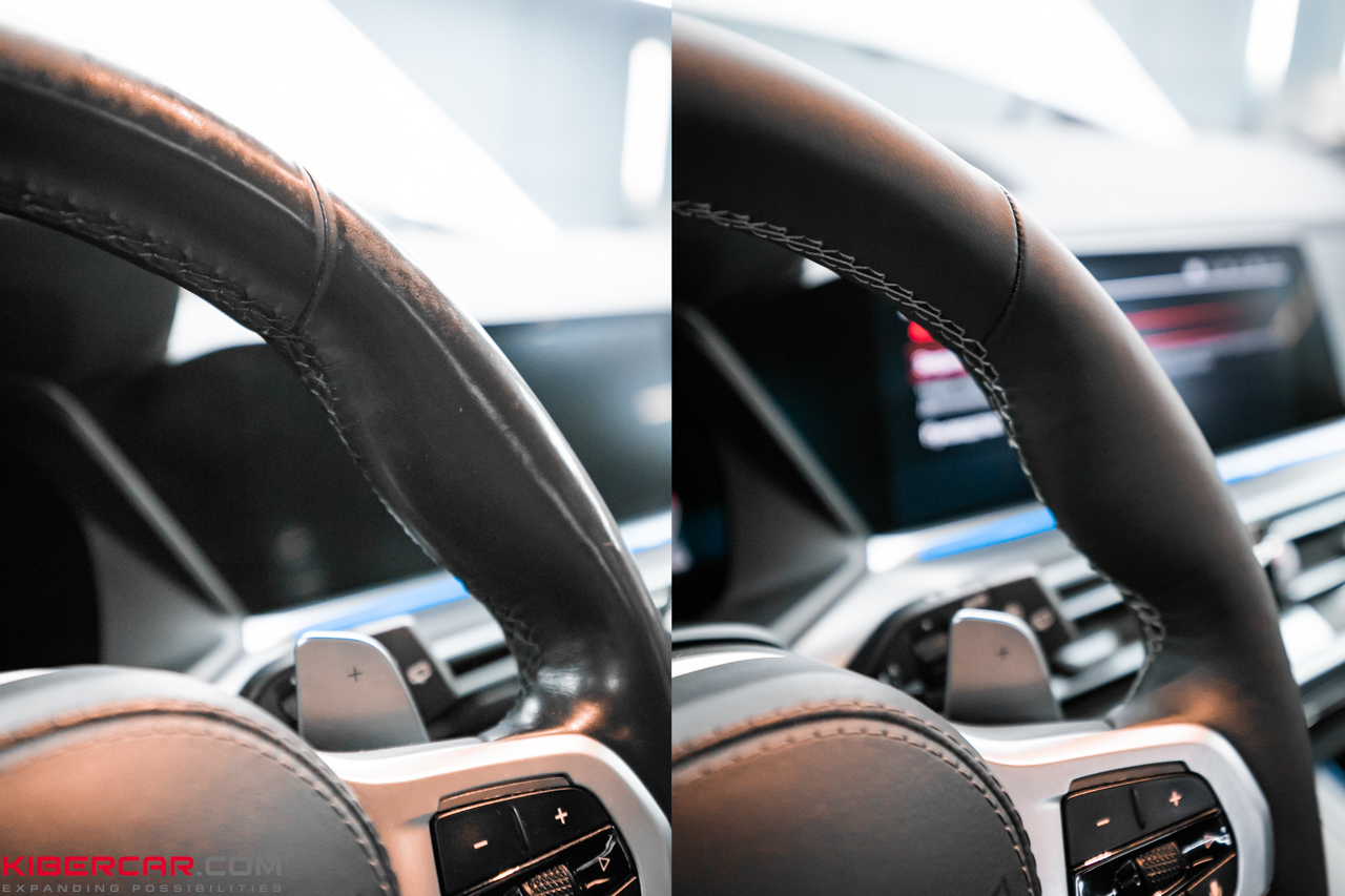 В нашем детейлинг-центре представлена обширная палитра оттенков кожи, что позволяет подобрать идеальный вариант для любого интерьера автомобиля. В данном случае мы остановились на оттенке, который максимально гармонировал с салоном данного BMW X5. Важно, чтобы руль не только выглядел красиво, но и органично вписывался в общий дизайн интерьера автомобиля.