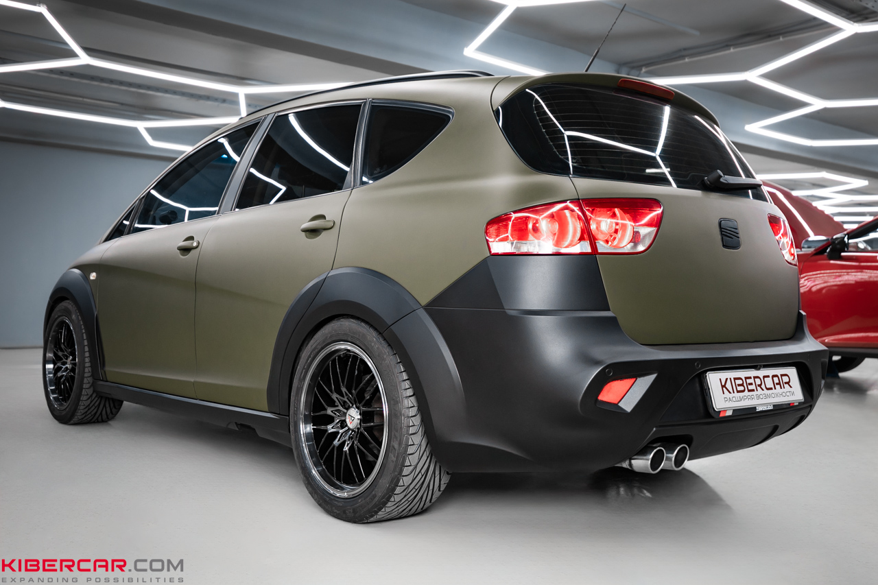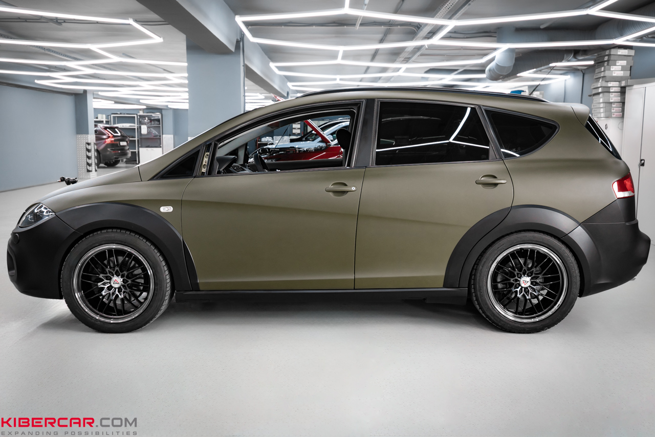 Для достижения желаемого результата окраска автомобиля SEAT Altea Freetrack проводилась в специализированной покрасочной камере с соблюдением всех технологий. Клиент выбрал уникальное цветовое решение, которое полностью преображает автомобиль. Основной кузов был окрашен в оливковый цвет с матовым эффектом. Это не только подчеркивает характер автомобиля, но и придает ему современный и стильный вид.
