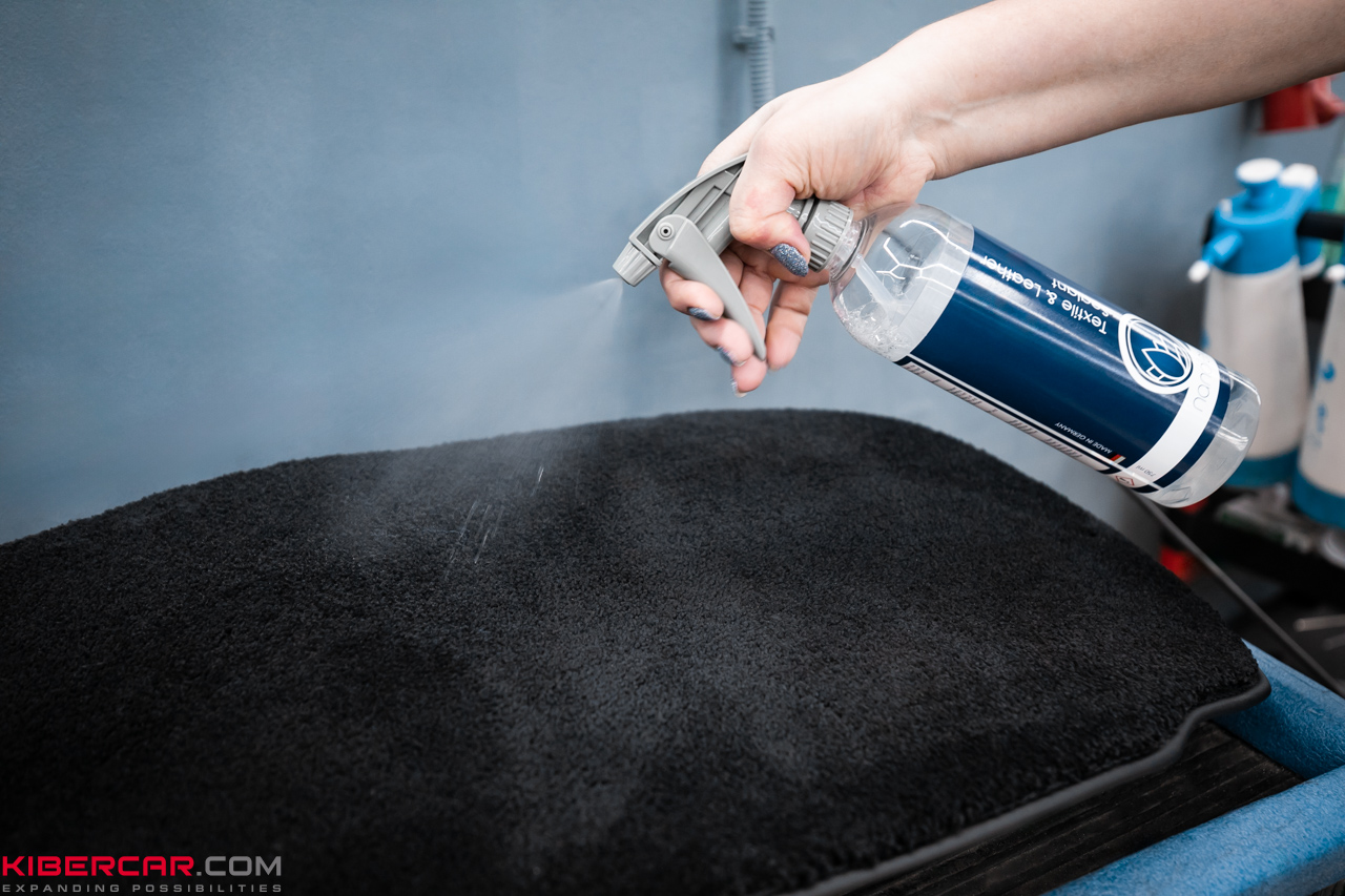 Для обработки ковриков и нижних поверхностей салона был выбран гидрофобный состав нового поколения. Он обеспечивает: