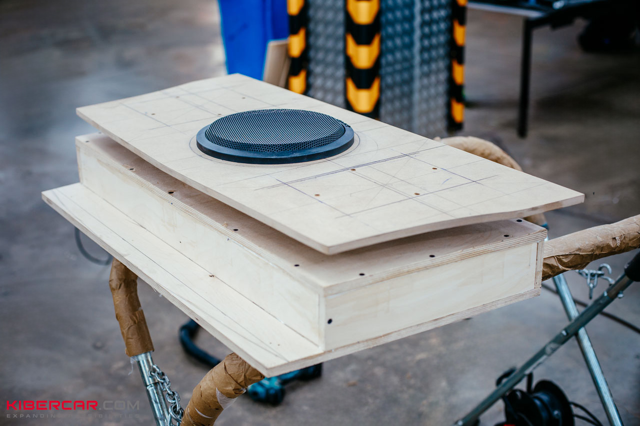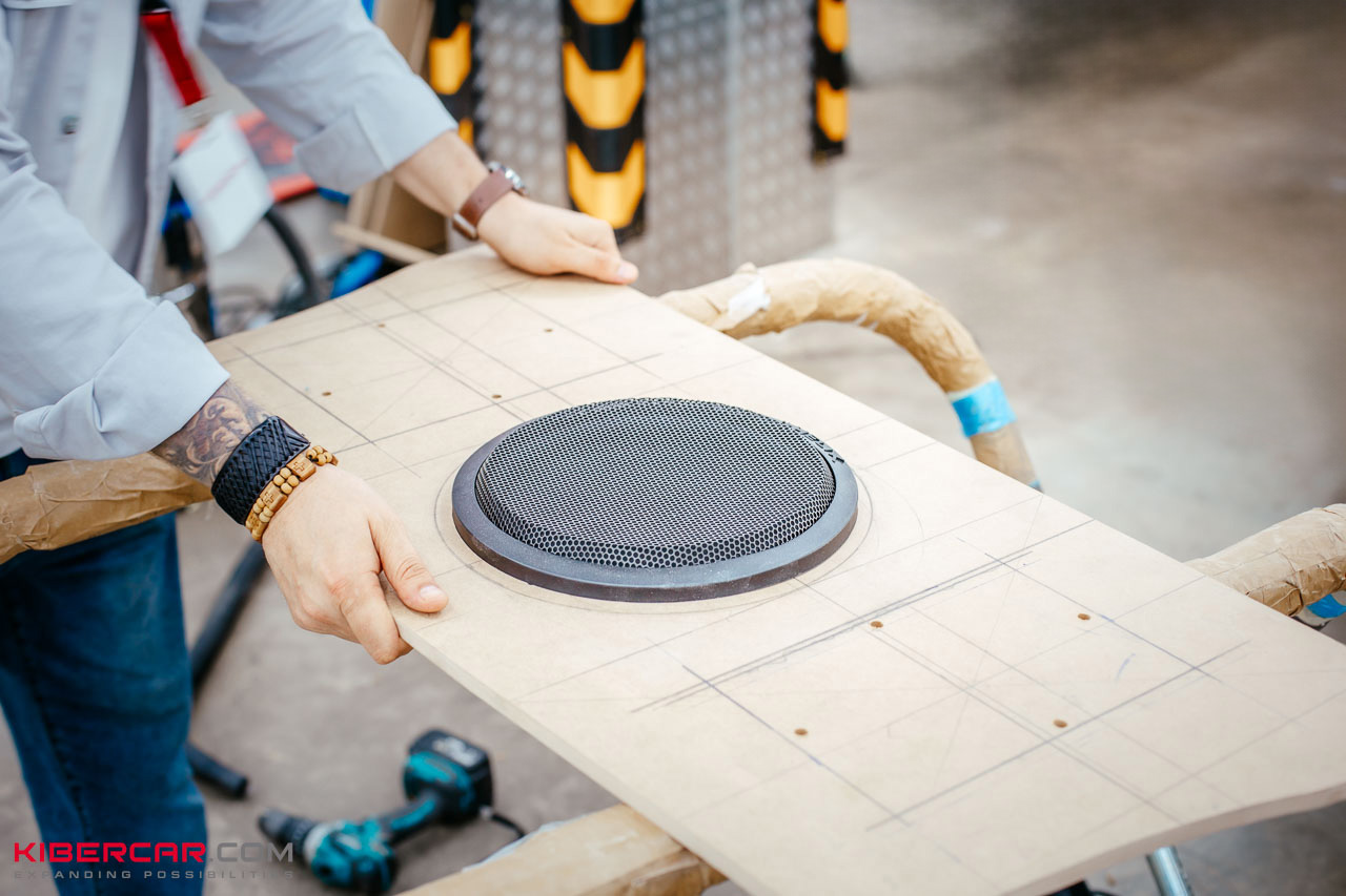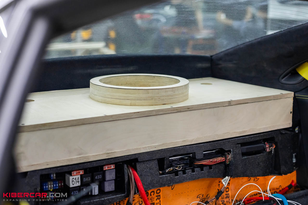 Особое внимание уделили установке сабвуфера. Подобрали модель с динамиком 10 дюймов, которого хватает для всего салона. Для установки сабвуфера и усилителей изготовили заднюю полку с оригинальной подсветкой и прострочкой в цвет нитей, которые используются в оформлении всей остальной кожи.