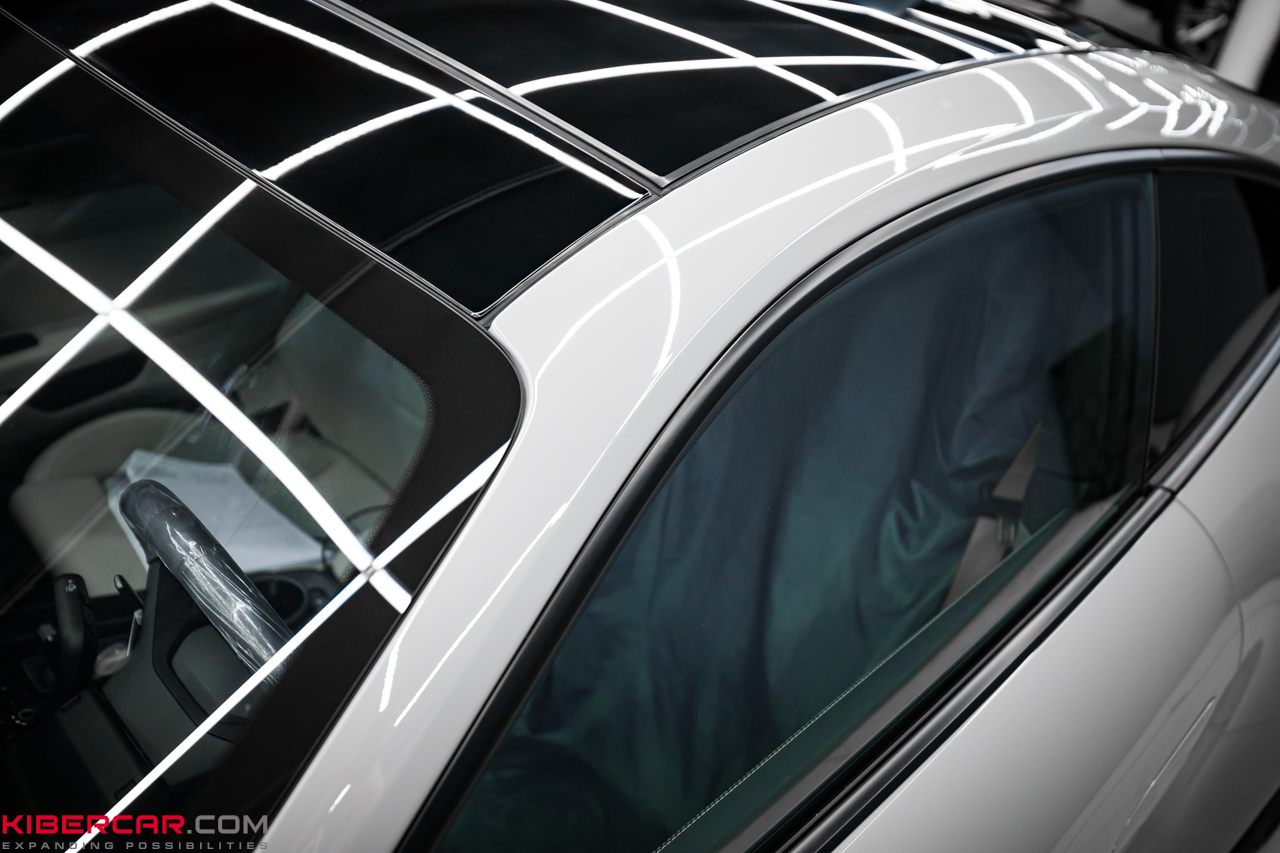Оклейка кузова пленкой – популярная услуга, наша команда выполняла ее неоднократно. Так что мы работали по проверенному алгоритму: вымыли автомобиль, высушили, сбрызнули мыльным раствором полиуретановую пленку и поэтапно наклеили ее на каждый участок. Особое внимание уделили углам и стыкам.