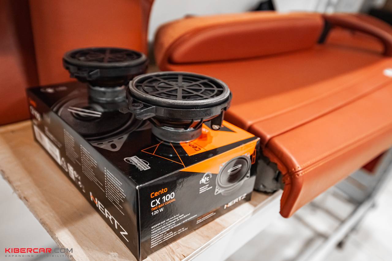 Чтобы добиться яркого звучания, под пассажирским сиденьем установили восьмиканальный усилитель АМР. Штатные высокочастотные твитеры в передней панели также заменили на качественные изделия компании ETON, лучше расширяющие спектр звучания аудиосистемы. Аналогично мы поступили со штатными динамиками в передних дверных картах – теперь вместо них стоят современные динамики немецкого производства. Среднечастотные динамики в передних дверях были заменены на продукцию компании CDT. Наконец, была произведена замена тыловых динамиков на аналоги Hertz.