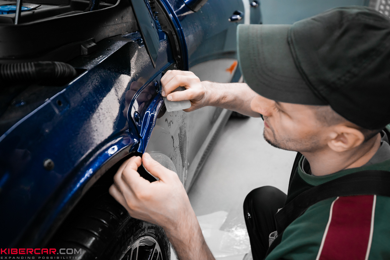 Пленку наносили поэтапно, внимательно обрабатывая каждый участок. Оклейку выполняли «мокрым» способом – сбрызгивали материал мыльным раствором, чтобы он лучше прилегал к поверхности. Затем, натягивая пленку, окончательно приклеивали ее к кузову и обрезали излишки.