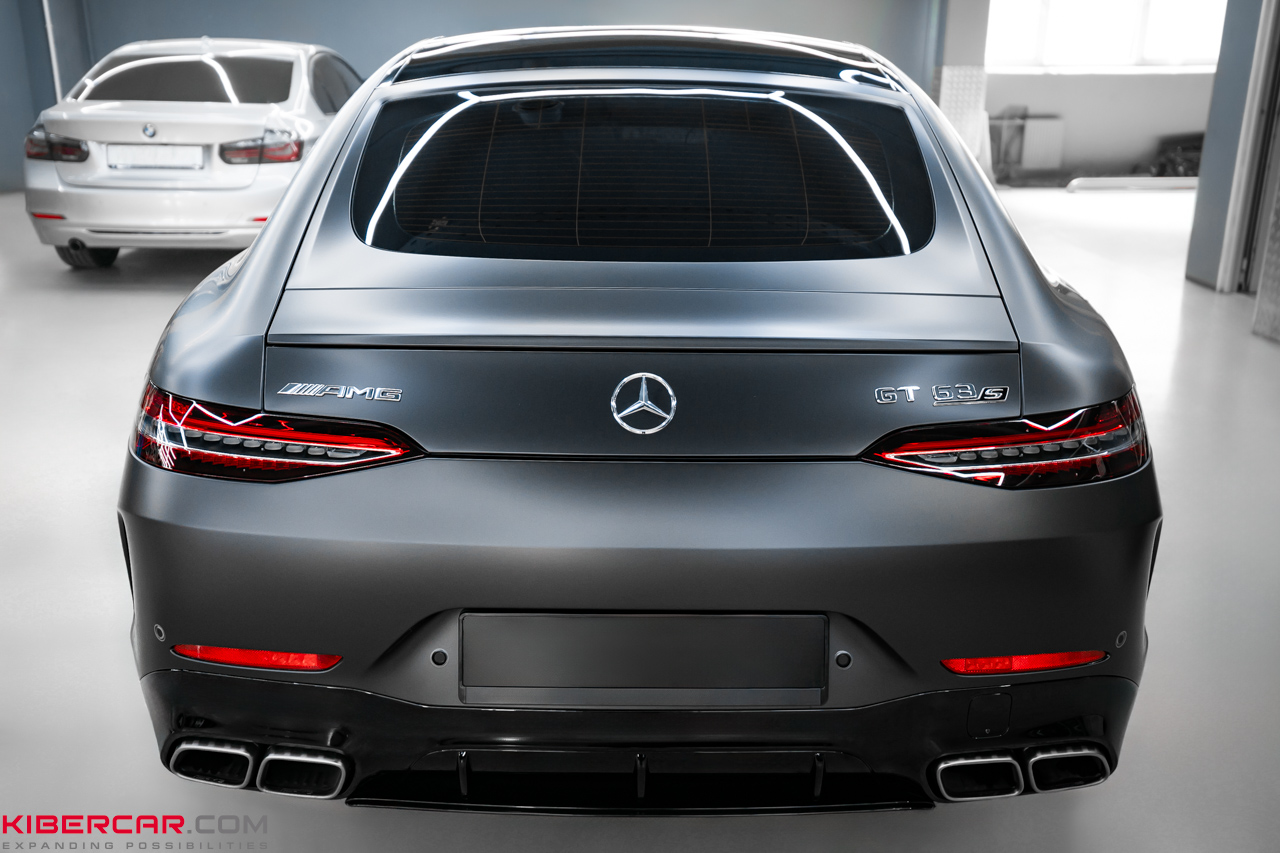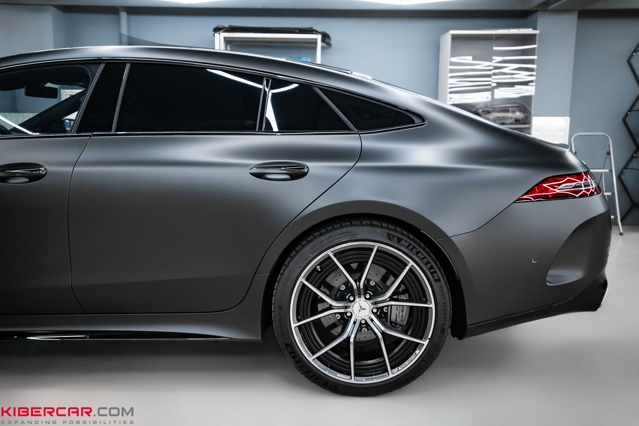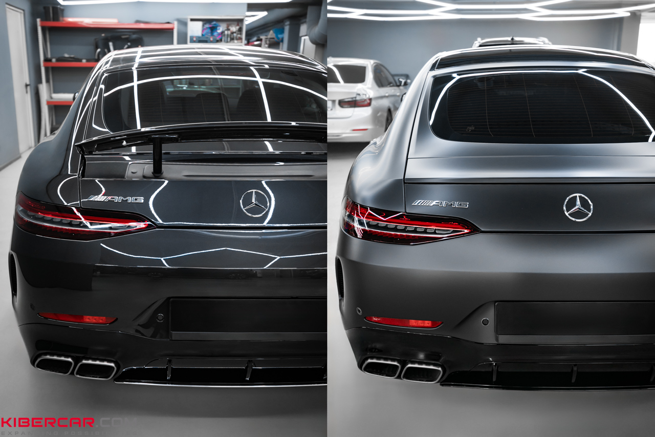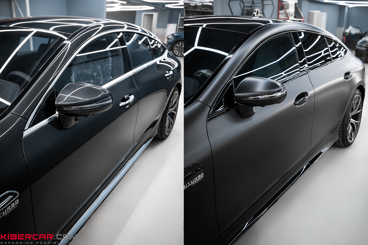 Полиуретановая пленка — это не просто способ изменить внешний облик автомобиля, но и эффективная защита лакокрасочного покрытия от механических повреждений. В отличие от винила, полиуретан обладает самовосстанавливающимися свойствами, устойчив к сколам, царапинам, ультрафиолету и агрессивной химии. А матовая фактура придаёт кузову благородный, сдержанный стиль, идеально подчёркивающий спортивные формы AMG GT.